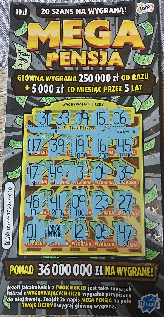 Wczorajszy zakup 1 sztuka wersja biała nr 013-20zł.(chodziłem w okolicy szukać dobrą wersję i przedziały). Najważniejsze ,że udało się wygrać na kolejne zdrapki