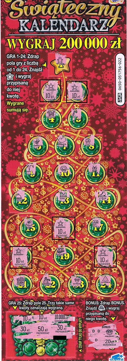 Skusilem się dzisiaj na 1 kalendarz i widzę że pojawiły się paczki z 3 transzy tj 116xxx. W polu 24 wydrapalem gwiazdkę warta 20zł