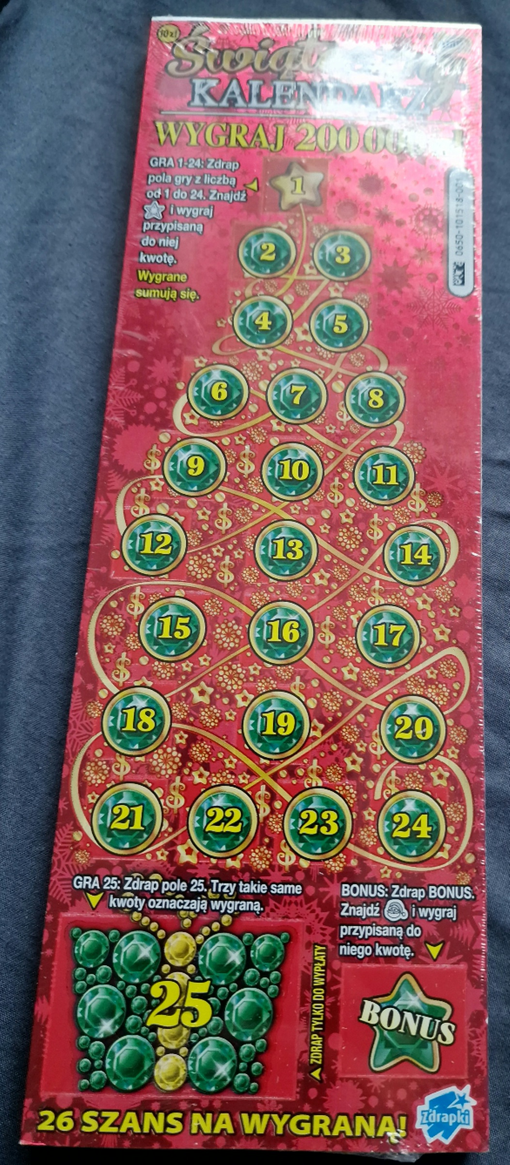 Ja chyba jutro kupię kilka kalendarzy które będę drapał po 1 okienku do świąt. Jeśli do tego czasu nie padnie główna to po świętach wracam do regularnego kupowania tej zdrapki o ile nadal będzie gdzieś dostępna, no i nr będą dobre