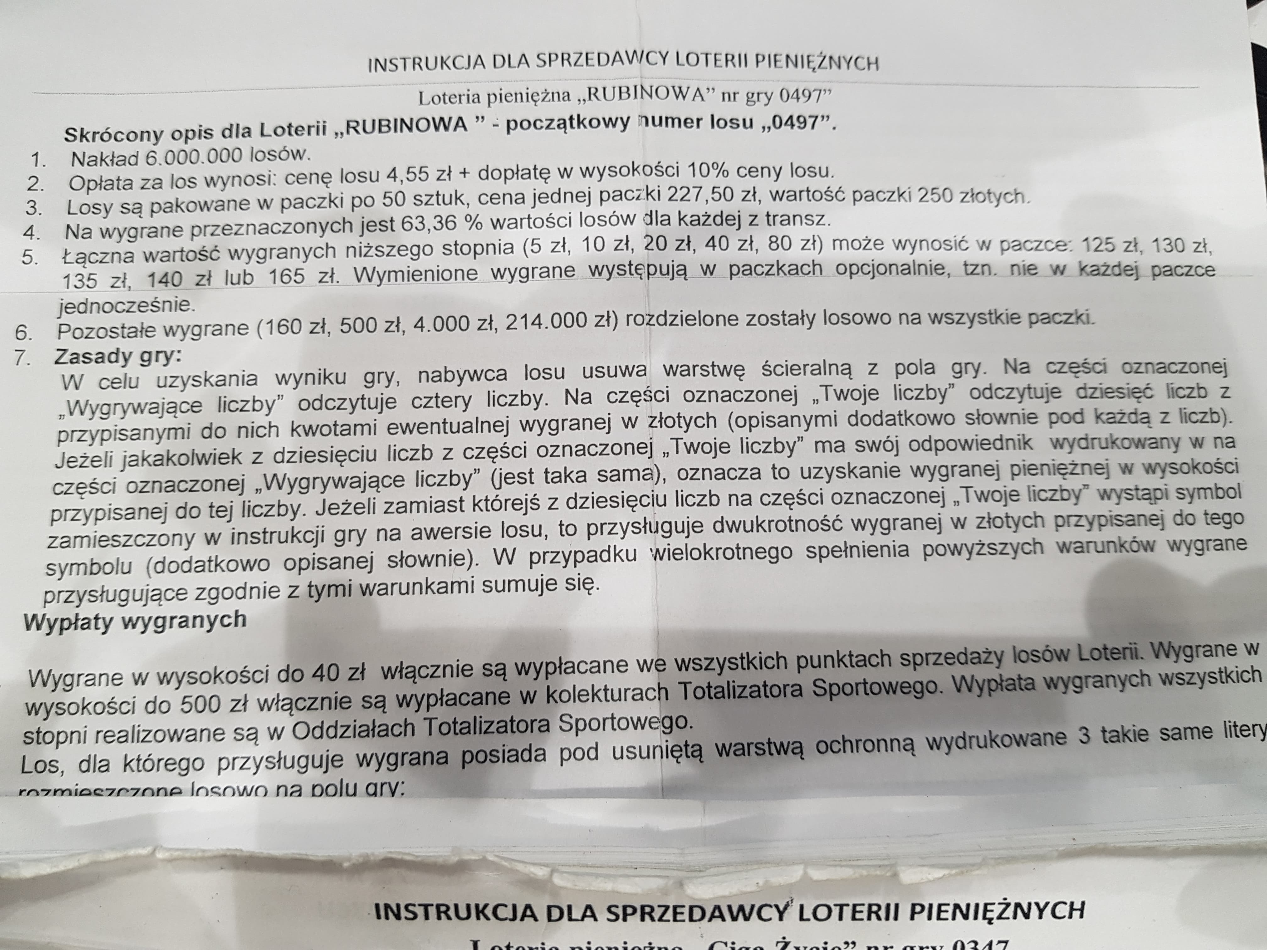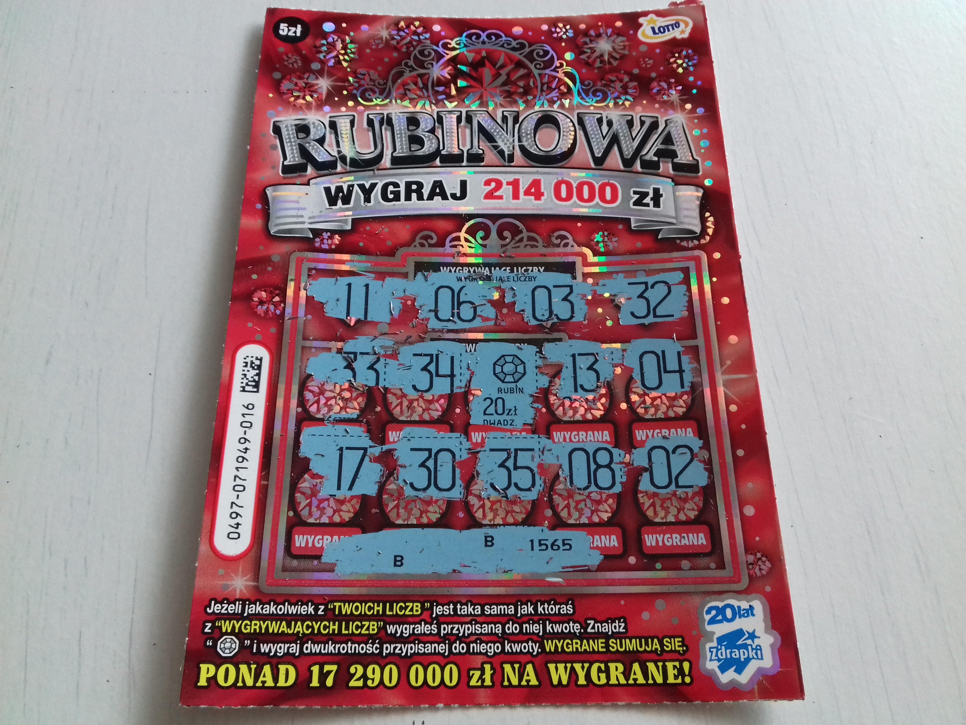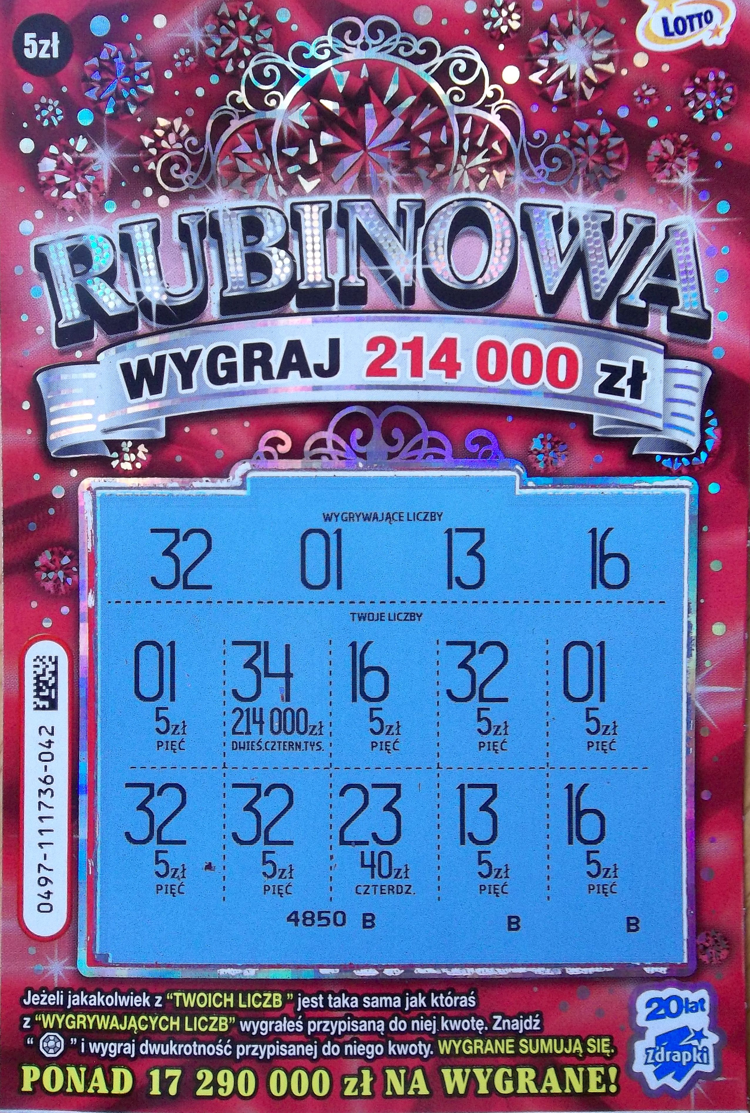 Czy na pewno w Rubinowej losowe zaczynają się dopiero od 160 zł? Zaciekawiło mnie to, ponieważ w paru miejscach było podawane, że nagrodą losową jest wygrana w wysokości 80 zł. Nota bene niedługo po premierze zdrapki udało mi się jedną trafić (literki MMM). W zdrapkach za 5 zeta próg losowych bywa przecież niższy. Analogicznie jak np. w Rozbij Bank czy Perłach i Diamentach, tam losowe są już od 70/75 zeta.