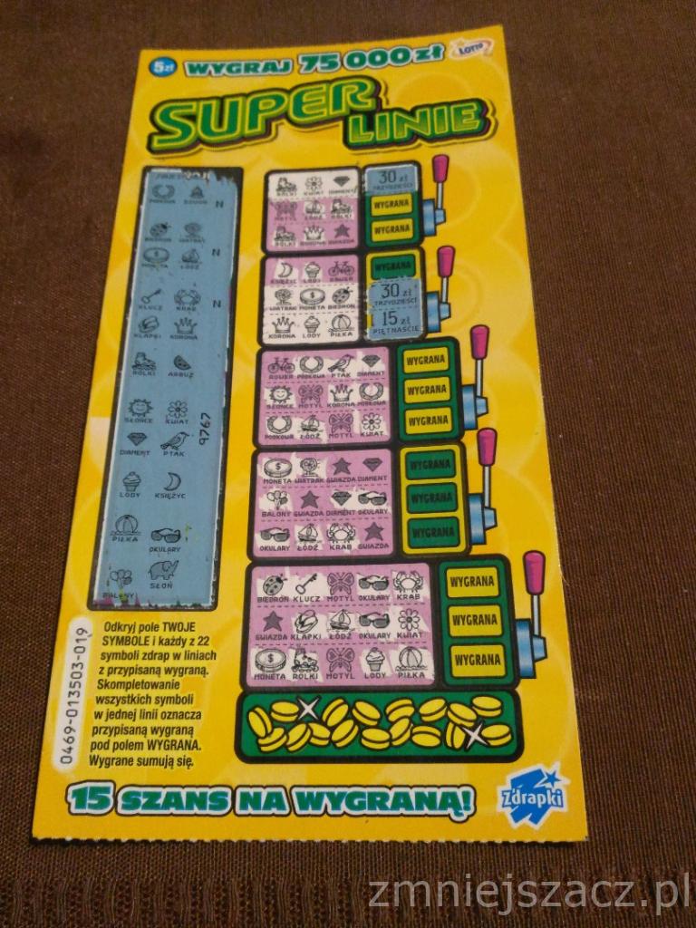 Ja 75zł trafiłem tylko raz i to przy sztuce. Szkoda ,że w SL nie ma tej głównej przynajmniej o wartości 100 000PLN, a tak to ją lubię chociaż nie wiem kiedy ostatnio ją drapałem.