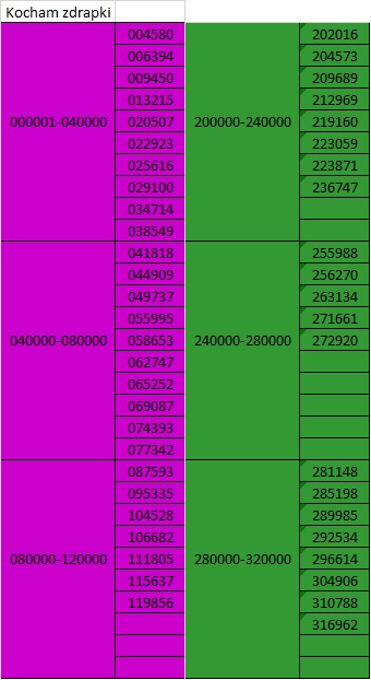 Tabelka dla kocham zdrapki bo tu też było dużo głównych wygranych. Na razie padły 52 z 60. Skanów jest 48, więc 4 brakują.