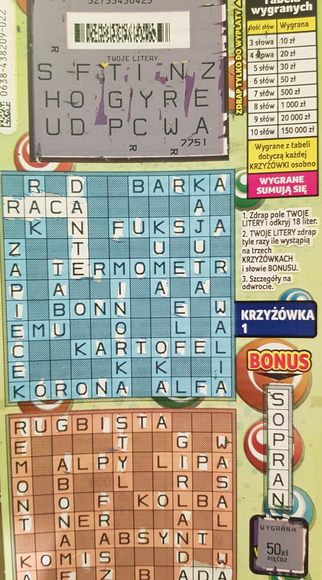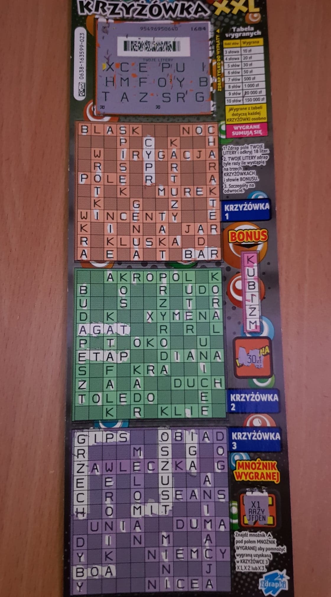 Ja spróbuję dziś wymienić na jednego bonusa 7 i dwie krzyżówki. Wczoraj sama wybierałam ta krzyżówkę pierwszy raz zwracałam uwagę na słowo bonusowe tak jak czytałam że np inni nie biorą jak jest litera A R i trafiłam te trzy dychy. Nie wiem czy to zwykły fart czy faktycznie coś w tym jest