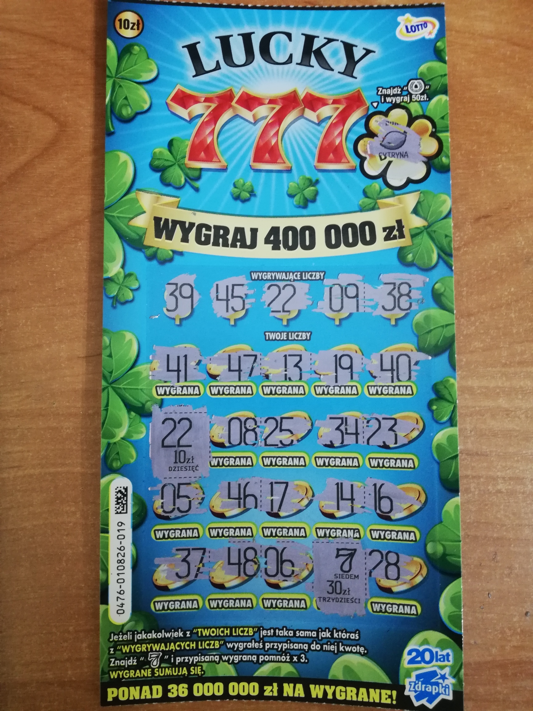 Wszystkie zdrapki z dużą ilością cyfr do odkrycia, drapie w ten sposób, że zaczynam od "Twoich liczb", potem wygrywajacych liczb, następnie ewentualne bonusy i literki kontrolne. W 3 sztuce lucky, zdrapalem całe pole "Twoich Liczb", niestety żadna "tłusta 7" się nie pojawiła, więc po kolei "Wygrywające liczby" zaczynając od prawej strony, ogólnie pusto, poza ostatnią zdrapaną liczbą - 12. Patrze, o 12 super, mam 12, pewnie 10 zł, zdrapuje pole 12, 400000 zł, momentalnie zrobiło mi się gorąco, wewnętrzny głos powiedział tylko, nareszcie, należało Ci się... Jednak radość trwała chwile... Okazało sie, że na jednej z 12, został paproch z warstwy ścieralnej, z 12 zrobiło się 42... Ogólnie zdarzyło mi się to 3 raz, ale poprzednie dwie pomyłki były mniejszego kalibru, więc i zawód mniejszy...