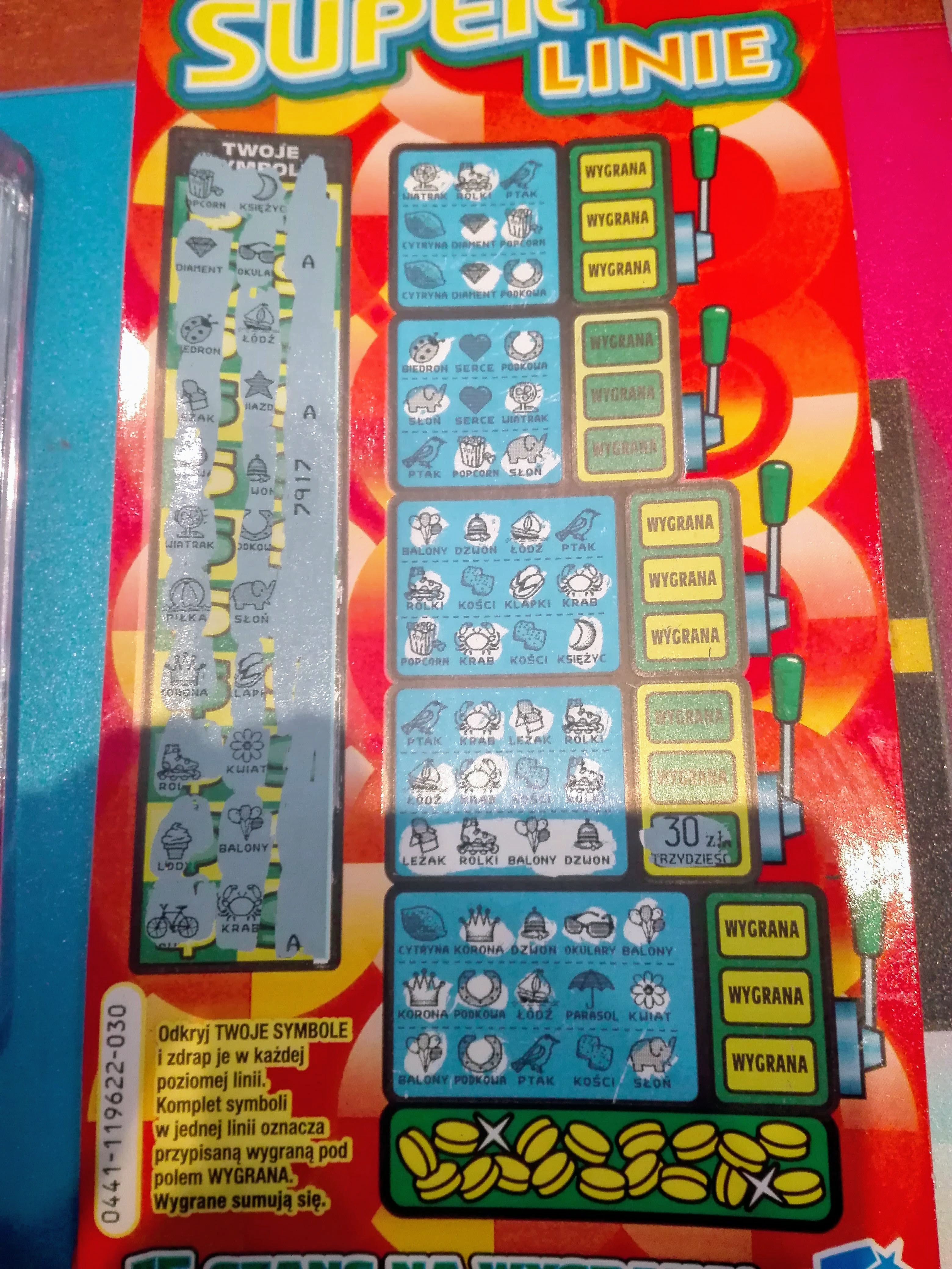 Z braku wszystkich innych interesujących mnie zdrapek skusiłem się dzisiaj na dwie super linie i nie wierzę, że w końcu szczęście w niej się do mnie uśmiechnęło, w jednej pustak a w drugiej 1x30zł