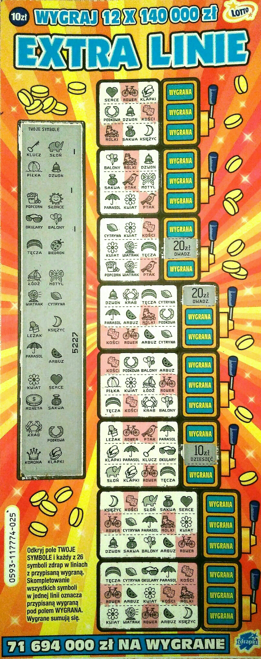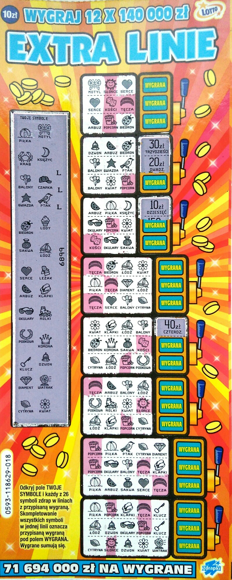 Kupiłem całą rodzinkę linii czyli za 3, 5, 10 i 20 złotych. Tylko Extra Linie były wygrane ale za to z jaką kwotą 100zł !!!!!!!