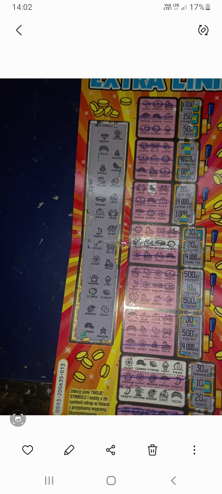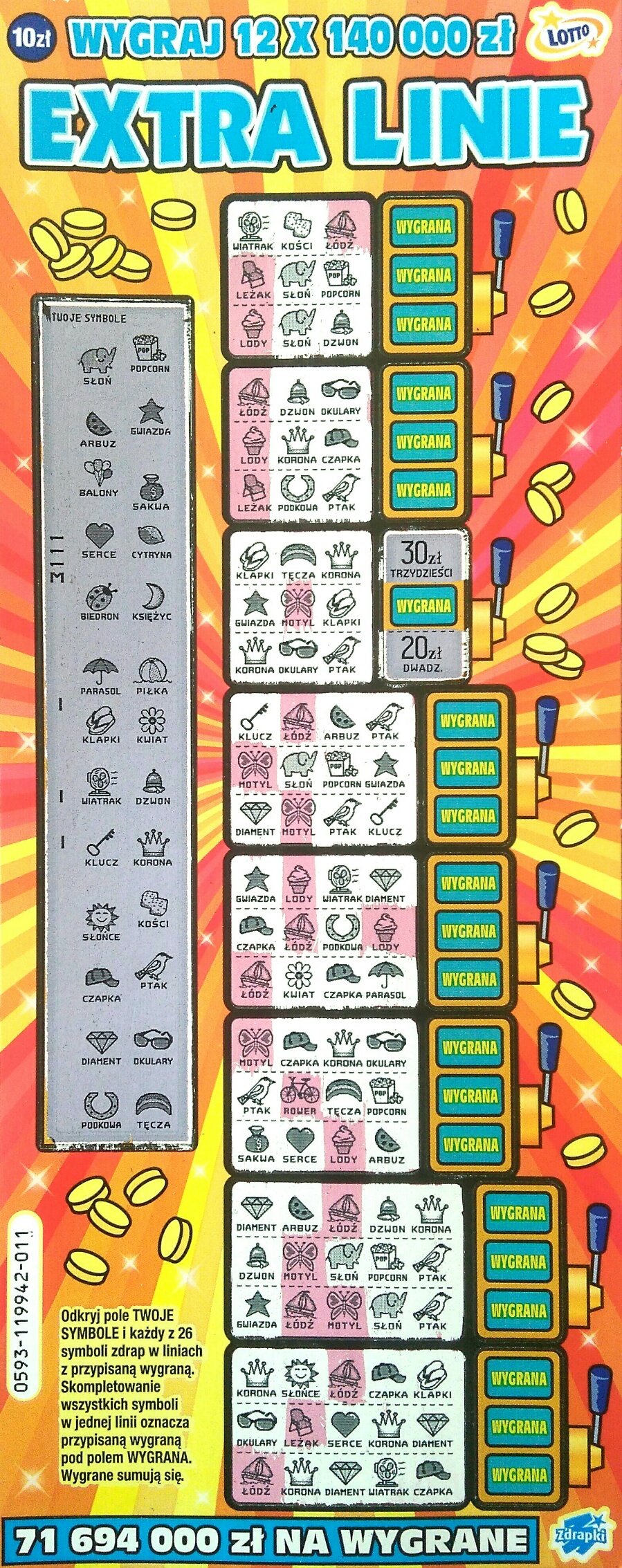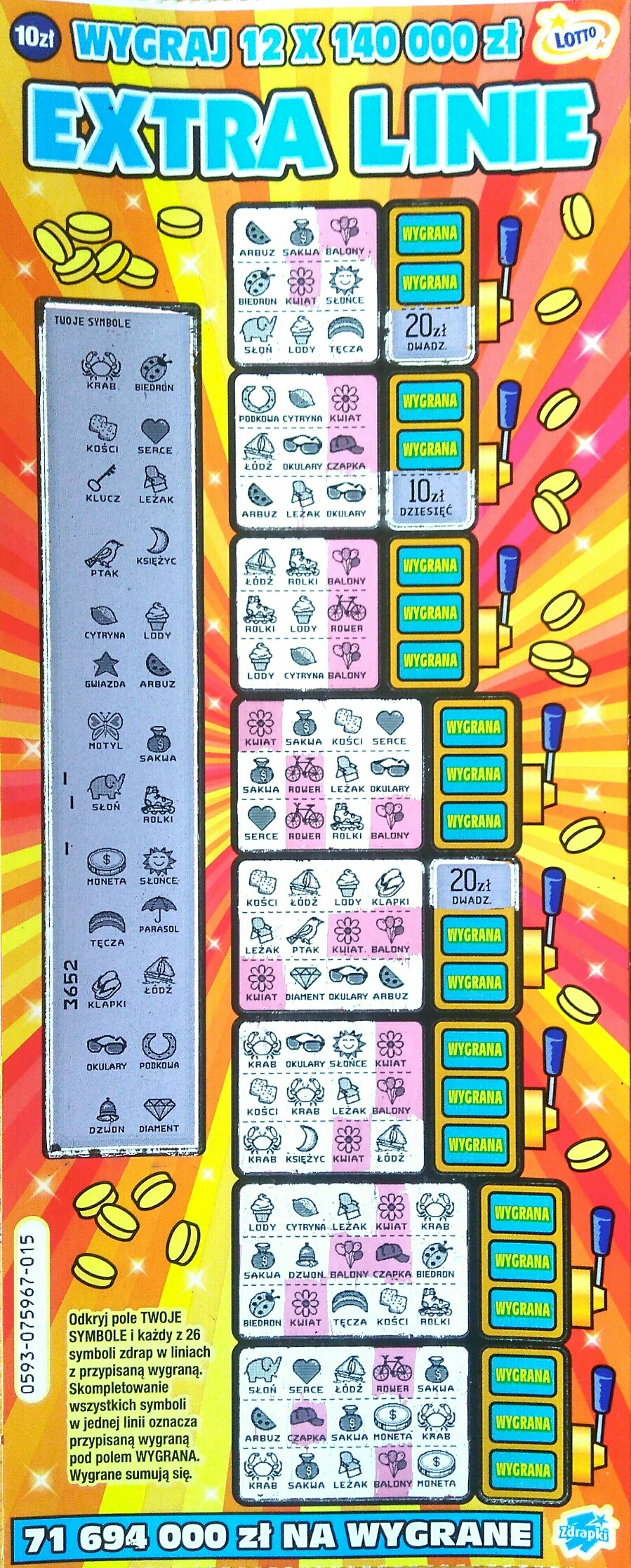 Dziś zakupione 2 sztuki nr 003 i 016-pustaki.Ostatnio coś nie idzie w tej zdrapce same pustaki trafiam.(Dziś zakupione 2sztuki ekstra pensja-obie pustaki, 1szt elektryzując cash-pustak, 1szt na tropie kasy nr 025-15zł i 2szt 10 x kasa pustak i 5zł.Razem 50zł wydane wygrane 20zł.Nie ma co narzekać ważne, że coś się trafiło.Powodzenia wszystkim życzę w drapaniu).