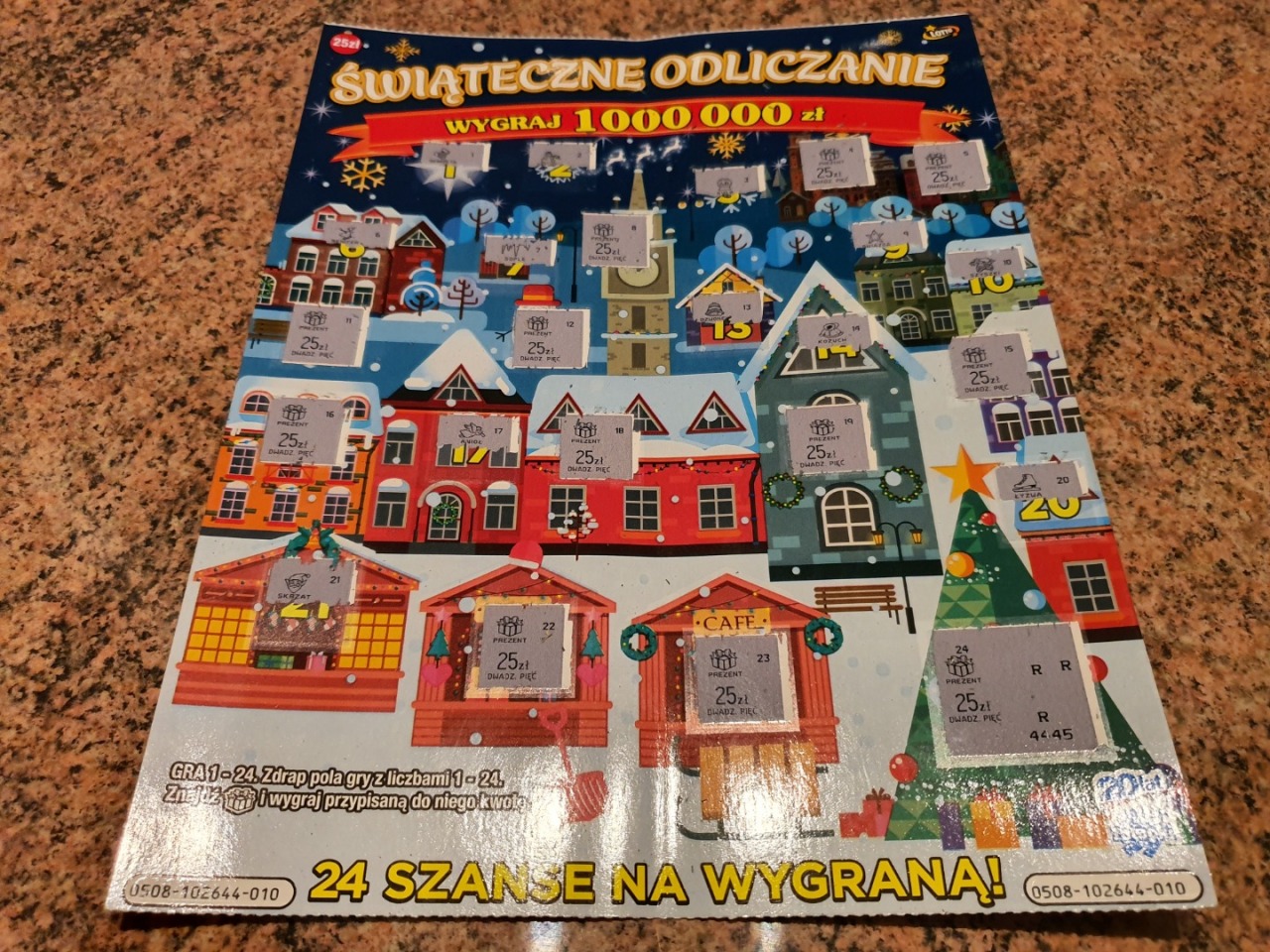 Wczoraj kupiłam dwie sztuki, 005 i 010.Trafiłam 50 zł w 005 oraz 25 zł w 010.Później kupiłam znowu dwie sztuki w innym punkcie, 007 oraz 004.W zdrapce z numerem 007 było 50 zł , w 004 było 25 zł.