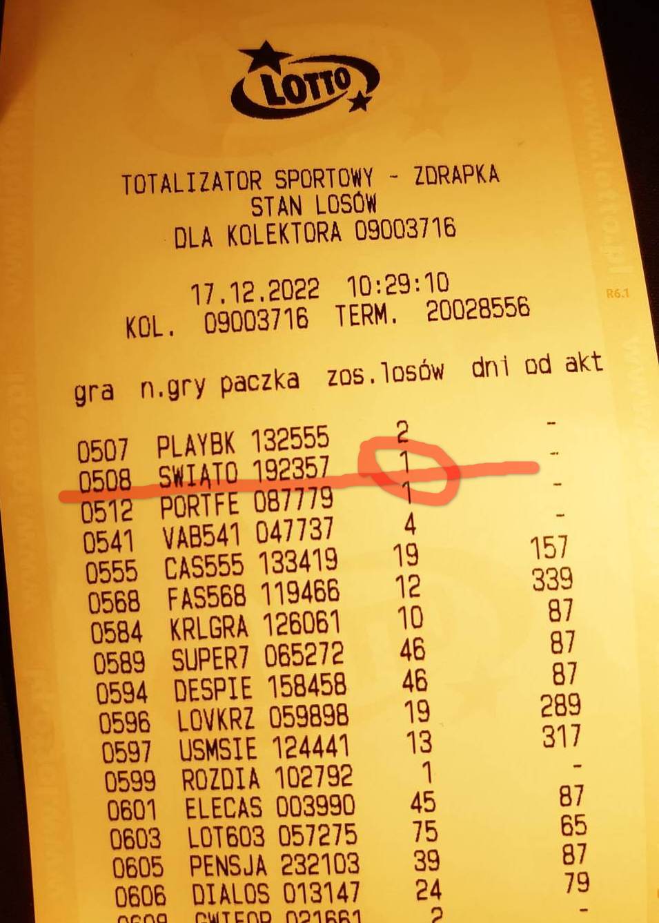 Z tego co już zdążyłem zauważyć, to na lottomacie mogą klikać tylko sprzedawcy do tego uprawnieni, ale i tak co drugi nie wie, jak sprawdzić stan losów. Jeden kliknie dwa przyciski i już wie, inny miota się wokół lottomatu, jakby pierwszy raz go widział. Proszę poprosić o sprawdzenie stanu losów lub aby kliknął raport. Załączam przykład takiego raportu z zaznaczonym ŚO, którego akurat fizycznie nie było.GLadi pisze: ↑21 gru 2022, 16:32Niegardów-Kolonia 60, sklep Euro - brak zdrapek