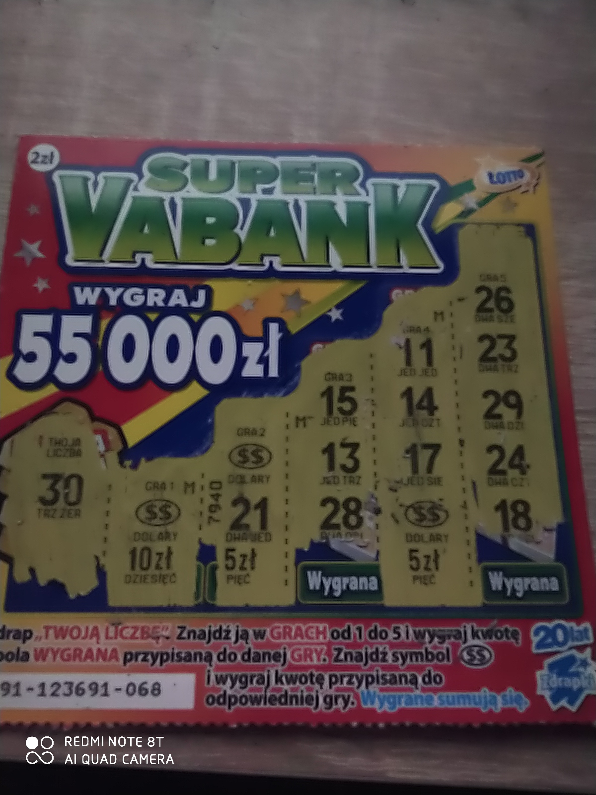 Ja się cieszę, że chociaż ten za 1zł przywrócili, bo też jest dobry. Multi vabank to była jedyna zdrapka za 5zł, która łączyła przyjemne z pożytecznym. Było dużo drapania i jednocześnie dobra tabela wygranych, chociażby 50zł co 2 paczki, gdzie normalnie krzyżówka, linie, wielka czwórka itp. nie miały takiego stopnia albo był w bardzo małej ilości.