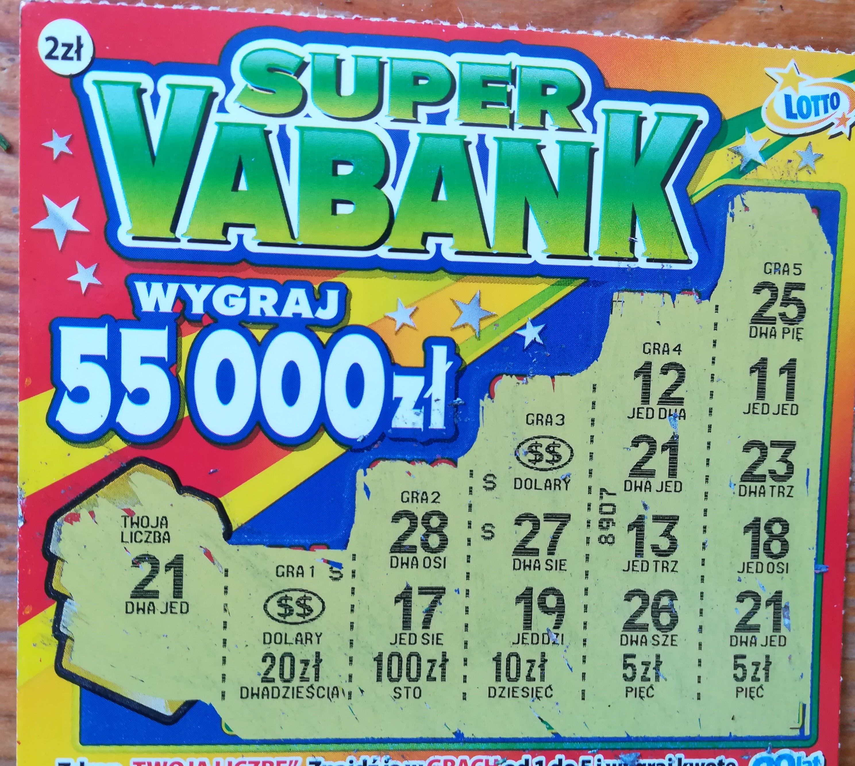 Ostatnio się nachwaliłem w innym temacie, że gram spokojniej i zwykle biorę 1-2 szt. przede wszystkim zdrapki za 2 zł. I jest przy jednej sztuce, miło bardzo.