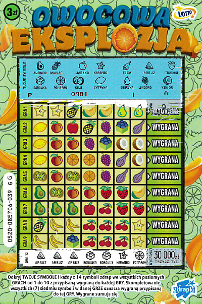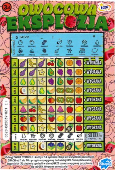 gratki kawka28 i wydrap głównąkawka28 pisze: ↑17 mar 2020, 23:43Dla mnie ta edycja owocowej szczęśliwie się zaczęła (w przeciwieństwie do fali pustaków w extra i super liniach), kupione może z 12 szt narazie, w tym 2 razy po 15 zł, wczoraj 30 zł, więc gram dalej z nadzieją że i w tej edycji główną do Krosna podeślą, tamtej było szkoda bo w mojej szczęśliwej kolekturzepotem czekam na szczęśliwe linie, zdrapki za 3 zł moja ulubiona grupa, ale może i na boom777 się skuszę czasem bo w big777 dobrze mi szło, ale jakoś szybko główne poszły i już później nie kupowałam
