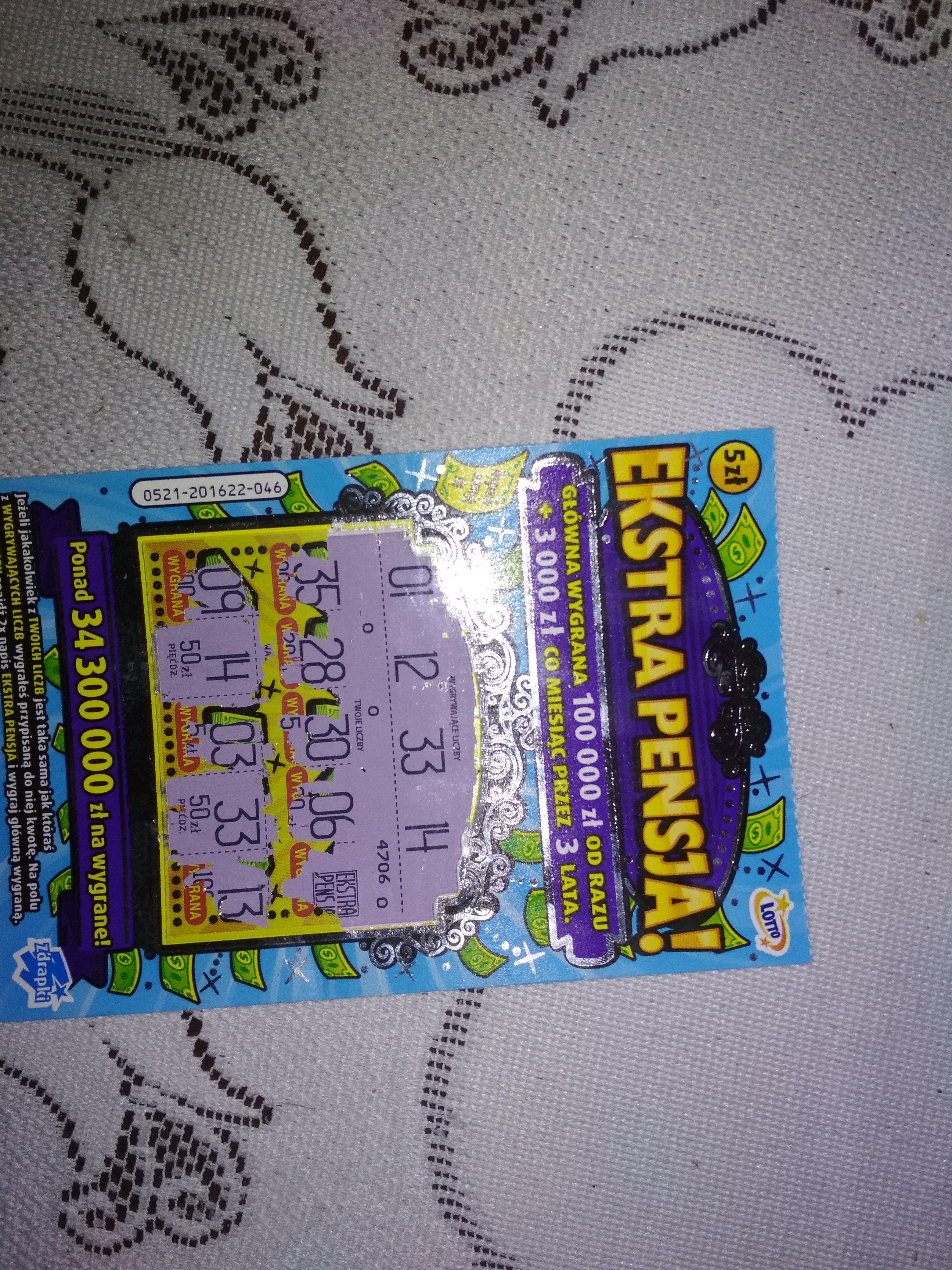 A ja już serka nie mogę. Ale dziś pstrąg wędzony też zadziałał (nie tak dobrze jak nabiał). Pan w rękawiczkach oderwał jedną z dołu i jedną z góry. W nr 49 było 50zł z ładnym rozkładem bo wszystkie dziesięć trafione. A w nr 2 przytrafiło się też 10 zł.