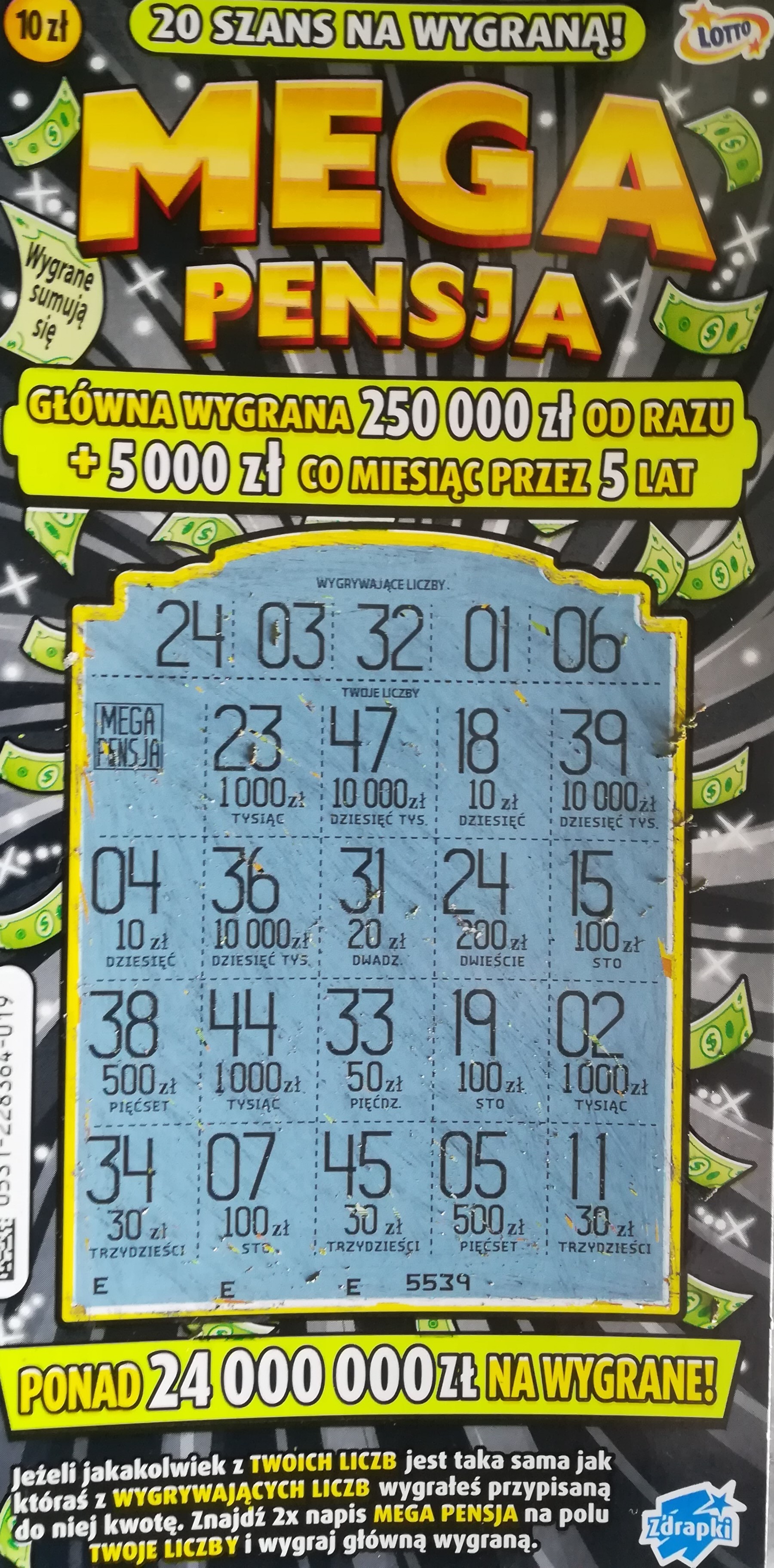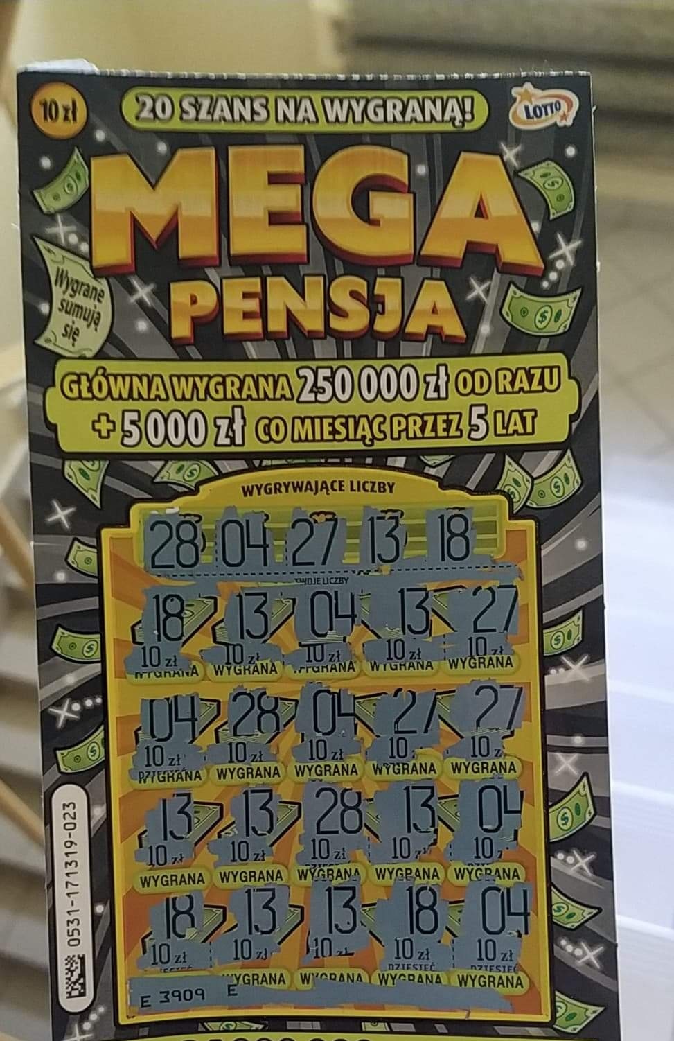Zwykle sporo się rozpisuję, toteż ostatnie głównie gram w liczbowe on-line z dużo większym skutkiem niż w kolekturze.. ale że trochę spokojniej, sięgam znów lekko po zdrapki. Mega Pensja była dla mnie jedną z najsłabszych zdrapek za 10, nie lubię jej - zwyczajnie, nawet nie wiedziałem że jest teraz premiera kolejnej odsłony, bo w ogóle nie śledziłem tematu. Biorę jakieś siódemki, podwójne kasy.. to mówię a poproszę jedną sztukę MP, patrze brzydka czarna, do wejścia na forum myślałem że to stara edycja. Wygrana jest skromna, ale patrząc na to jak rzadko biorę zdrapki za 10 (bo raczej za 2-3-5), i że jedną sztukę mojej pechowej serii... to jestem bardzo zadowolony, może się przeproszę z MP : D. Przy tym co padało na forum to śmiech na sali, ale że nie biorę nigdy hurtem zwłaszcza droższych. to jestem zadowolony. Wcześniej najwięcej miałem 100 w 500 tys bankowej.