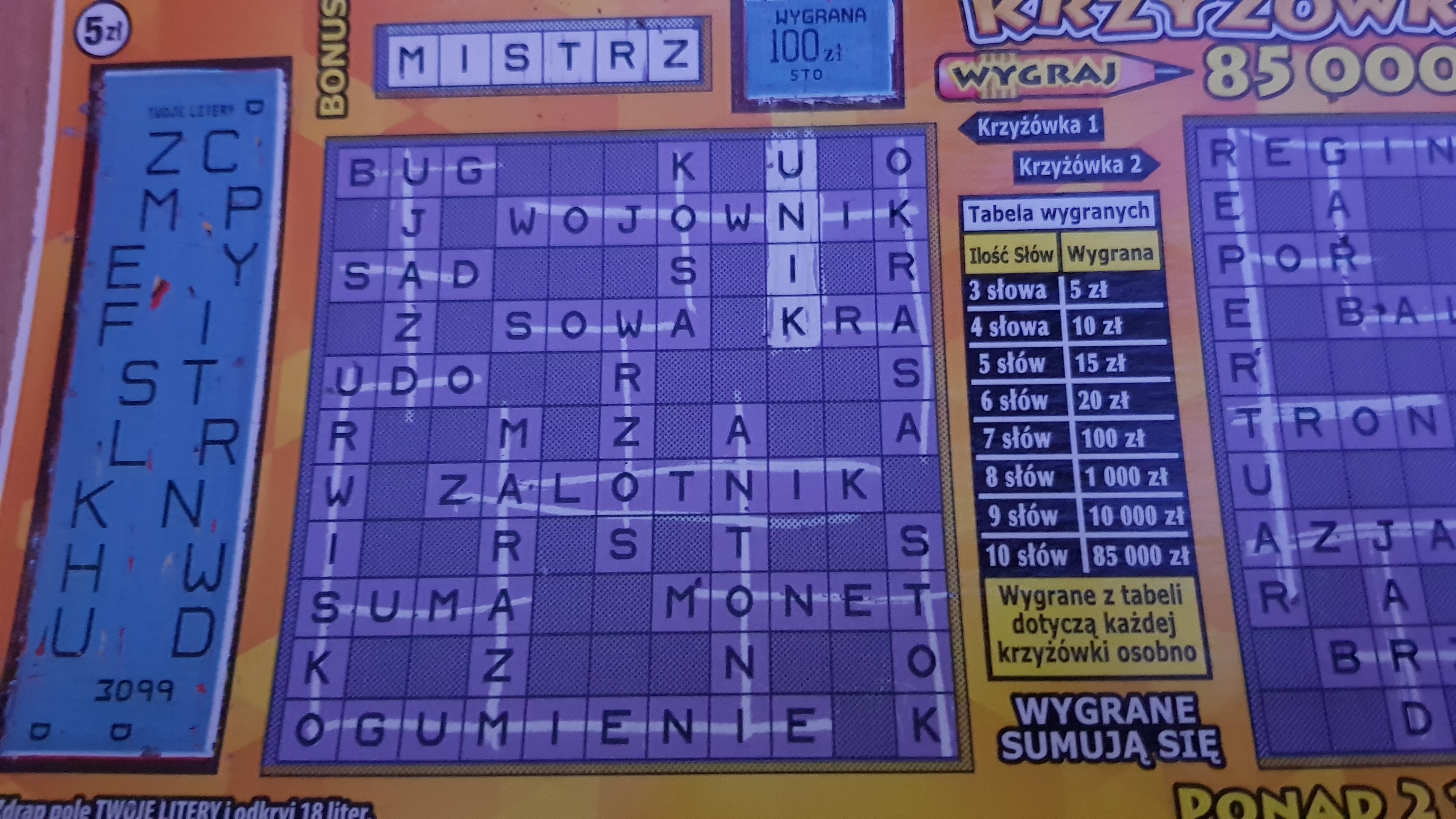 Po raz pierwszy w tej edycji wpadło 30 zł (031). Kupiona 1 sztuka. Wygrana rozbita na 2x 15 zł w obu polach gry. Bonus pusty.