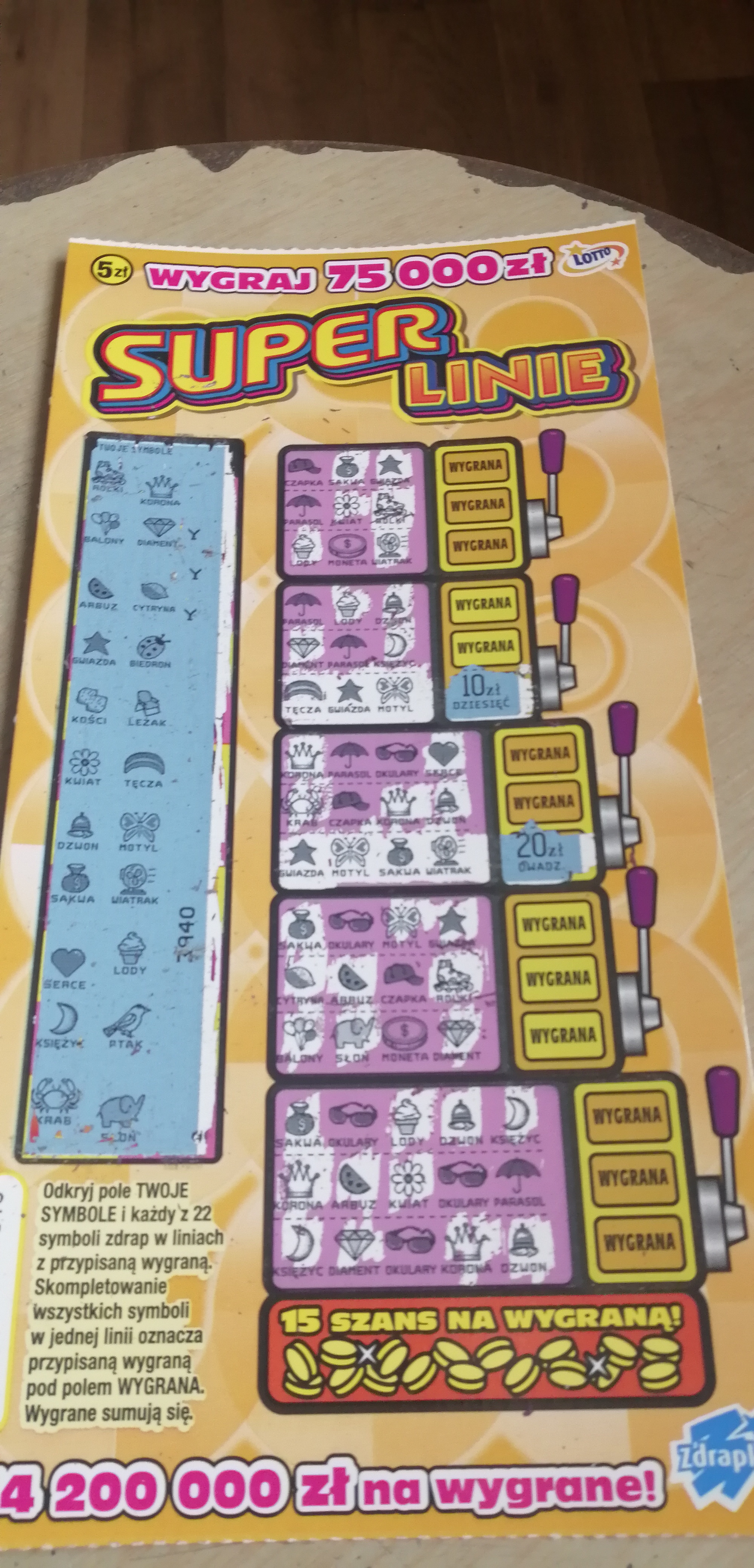 Jak dotąd drapałem 4 sztuki Super Linii i nie trafiłem na żadnego pustaka. 2x 5 zł, 1x 10 zł i 1x 15 zł. Polujemy na większe kwoty!