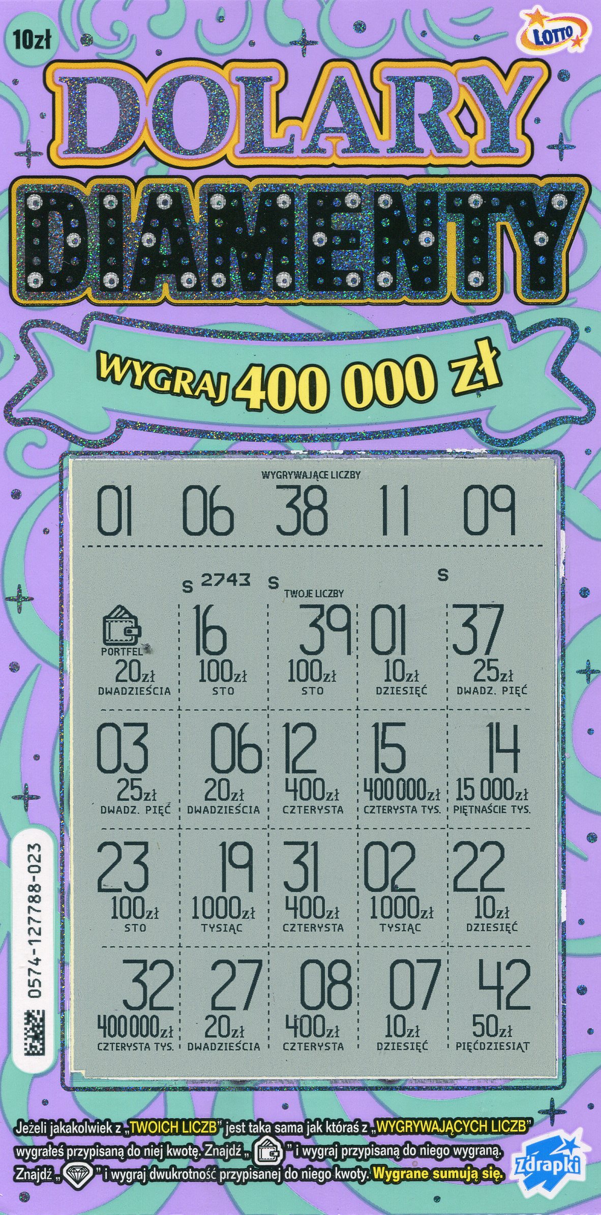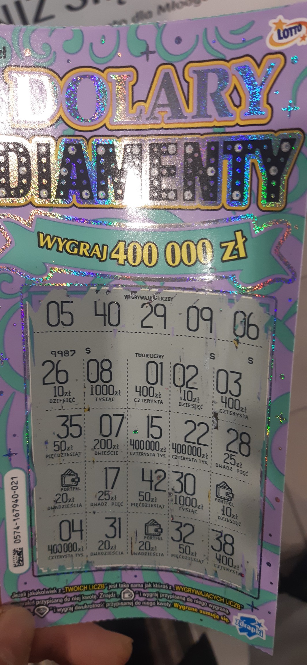 No cóż, wziąłem trzy sztuki z prawdopodobnie nowej paczki. Numer 1 i 2 puste, pod 3 zwrot więc mam minus 20 zł. Generalnie drapie się dobrze, wygląda fajnie, ale przechodzę na 500 w banku/Premia 777 w segmencie za dyszkę jeśli już. Mam też podejrzenie, że naprawdę mieszają paczki,ale i sam jestem sobie winien - byłem w typowym punkcie gdzie drapią na miejscu, a i na tablicy jak zerknąłem przy wyjściu masa 50 zł wygranych w Dolarowo-Diamentach. Pewnie wyskubane i reszta została.