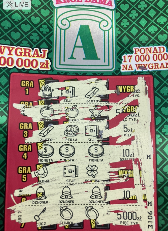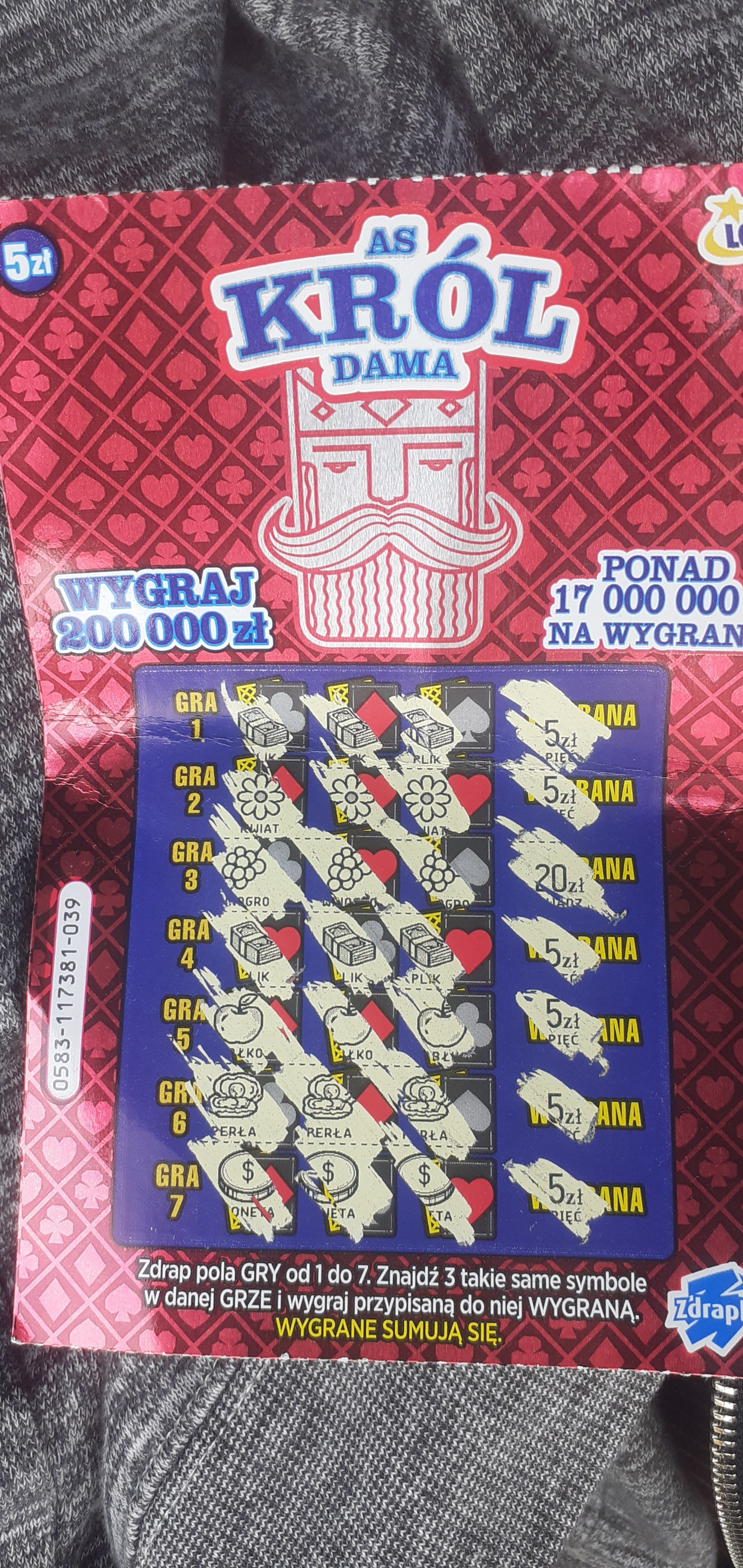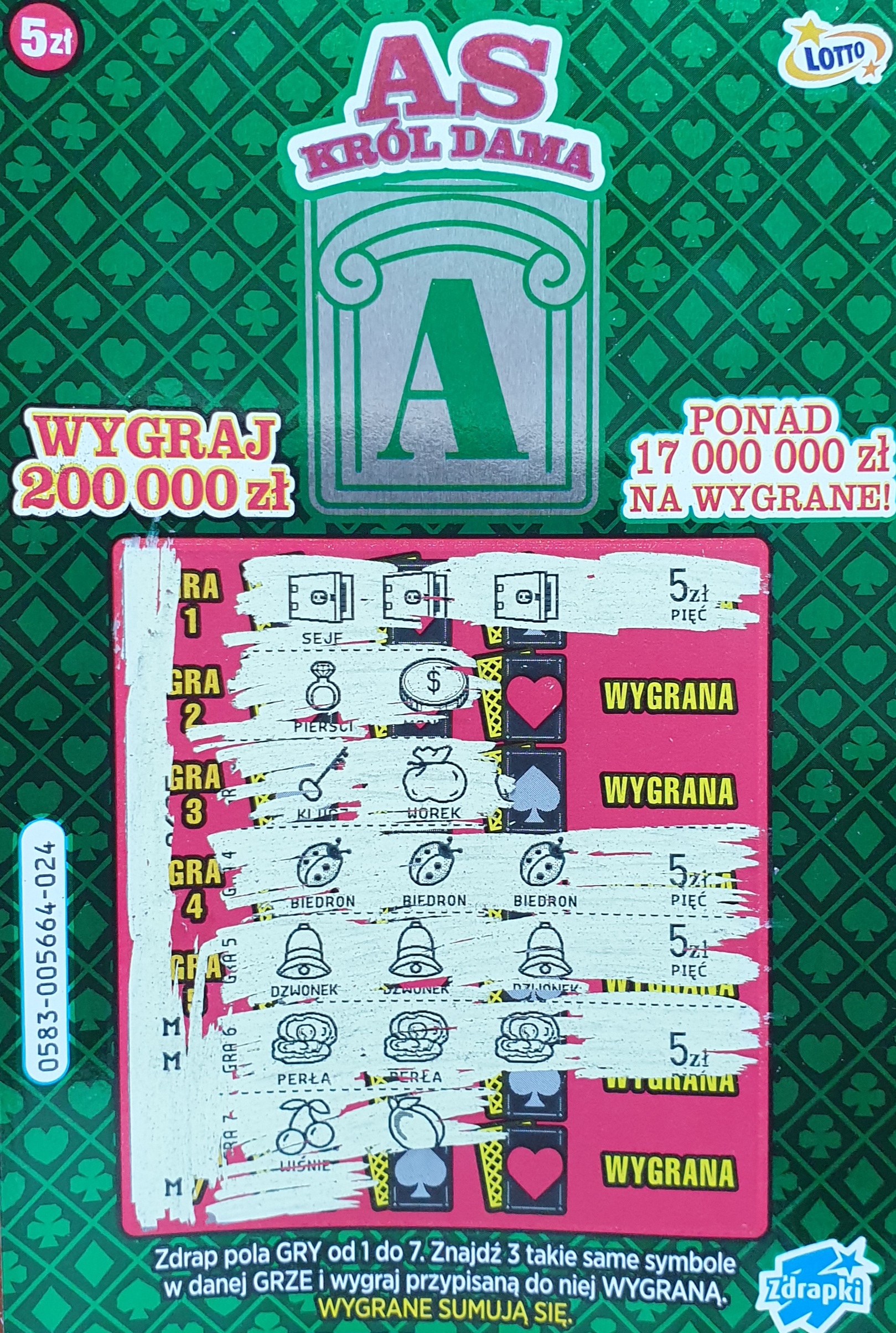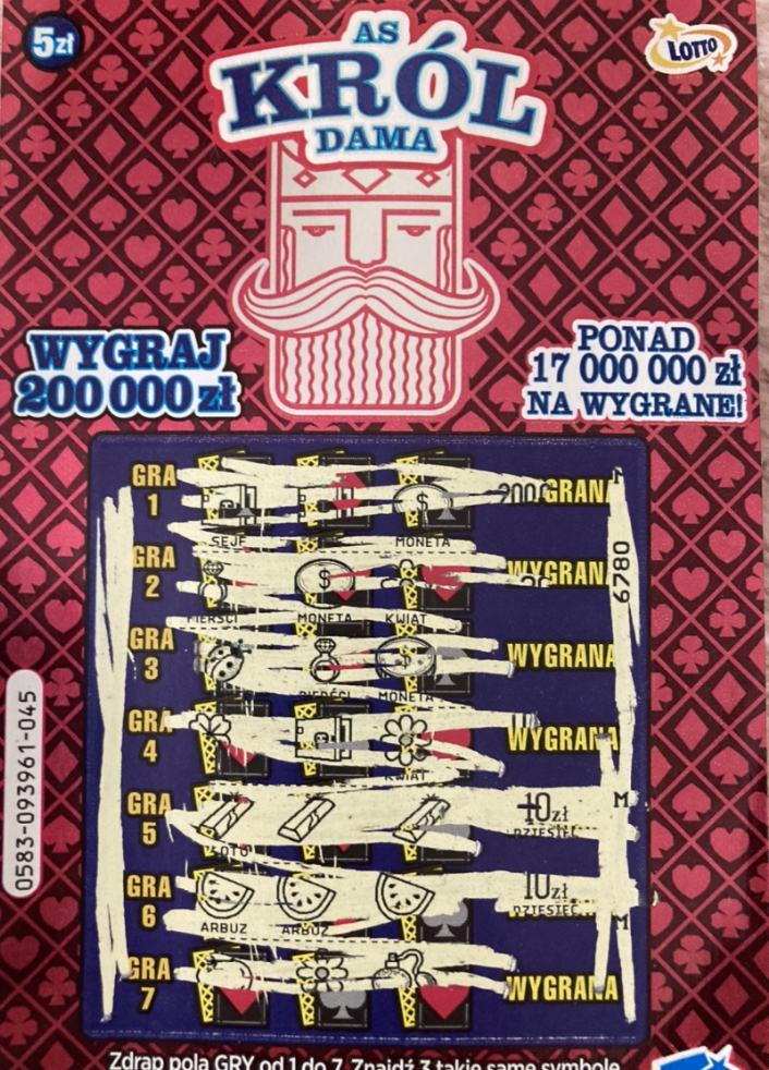 Gratulacje, aczkolwiek dla mnie to jest bardzo nieudana zdrapka. Można zdrapać całą zdrapkę i nie odnaleźć w ogóle dwóch takich samych symboli, co psuje całkowicie zabawę i pozbawia jakichkolwiek emocji.
