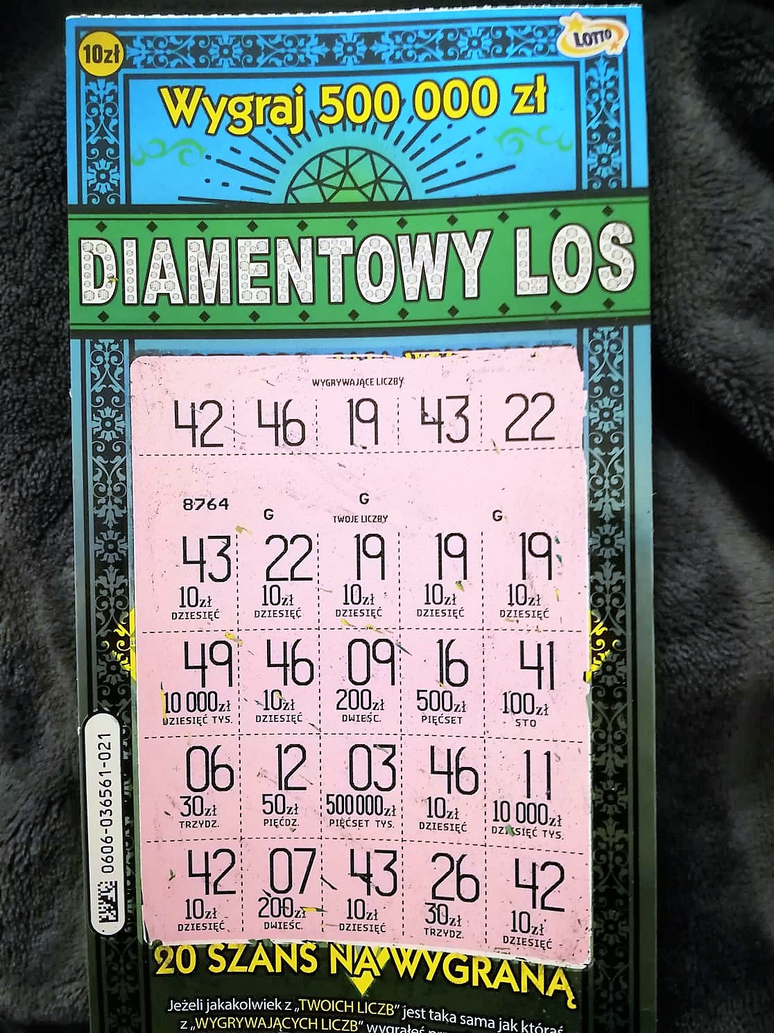 Stefanek ! I takie coś ja lubię ! Nigdy premiera nie przyniosła mi nic takiego. Ostatnio miałem rozbrat z lotto - mało kasy, raczej jedna-dwie sztuka dziennie czegoś za zeta, czasem dwa. No i taki zniechęcony byłem, wchodzę po pracy do spożywczaka.. bez większych oczekiwań: poproszę jedną sztukę tej nowej diamentowej. I sprawdza się moja zasada - nieplanowane zakupy, żadne zestawy kilkunastu zdrapek na raz. Bardzo cieszy, bo przy pierwszej sztuce i jedynej ; )