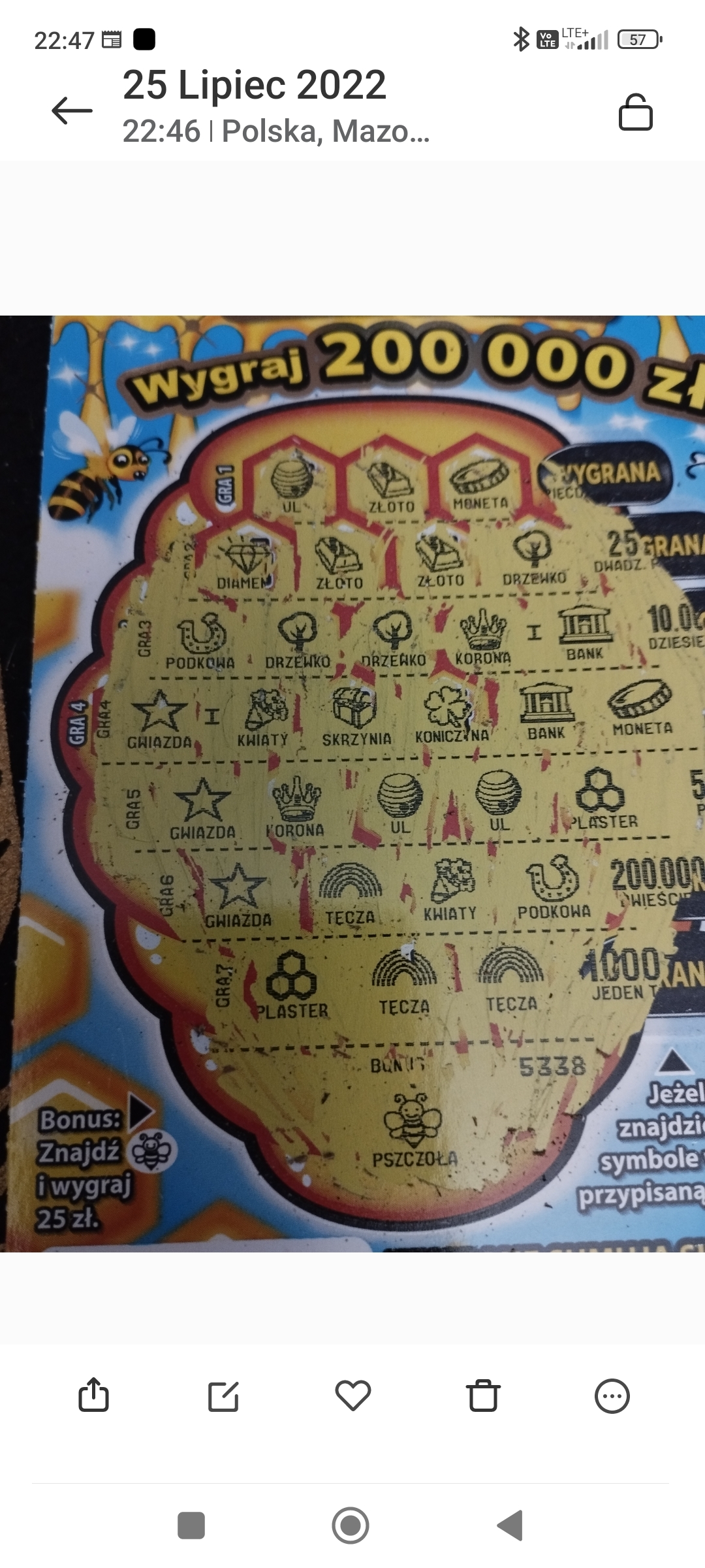 Wieczorem poszedłem jeszcze wymienić i wziąłem 10x kasa (pusta). Dałem też szansę plastrowi miodu choć to jeden z najbardziej nieszczęśliwych dla mnie losów. Ku zdziwieniu w bonusie wydrapałem pszczółkę za 25zł, szok