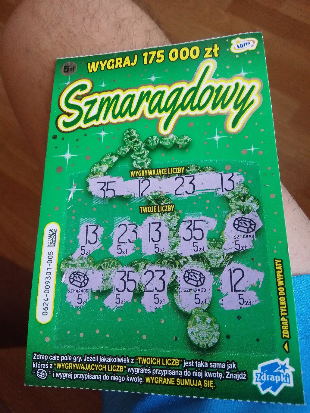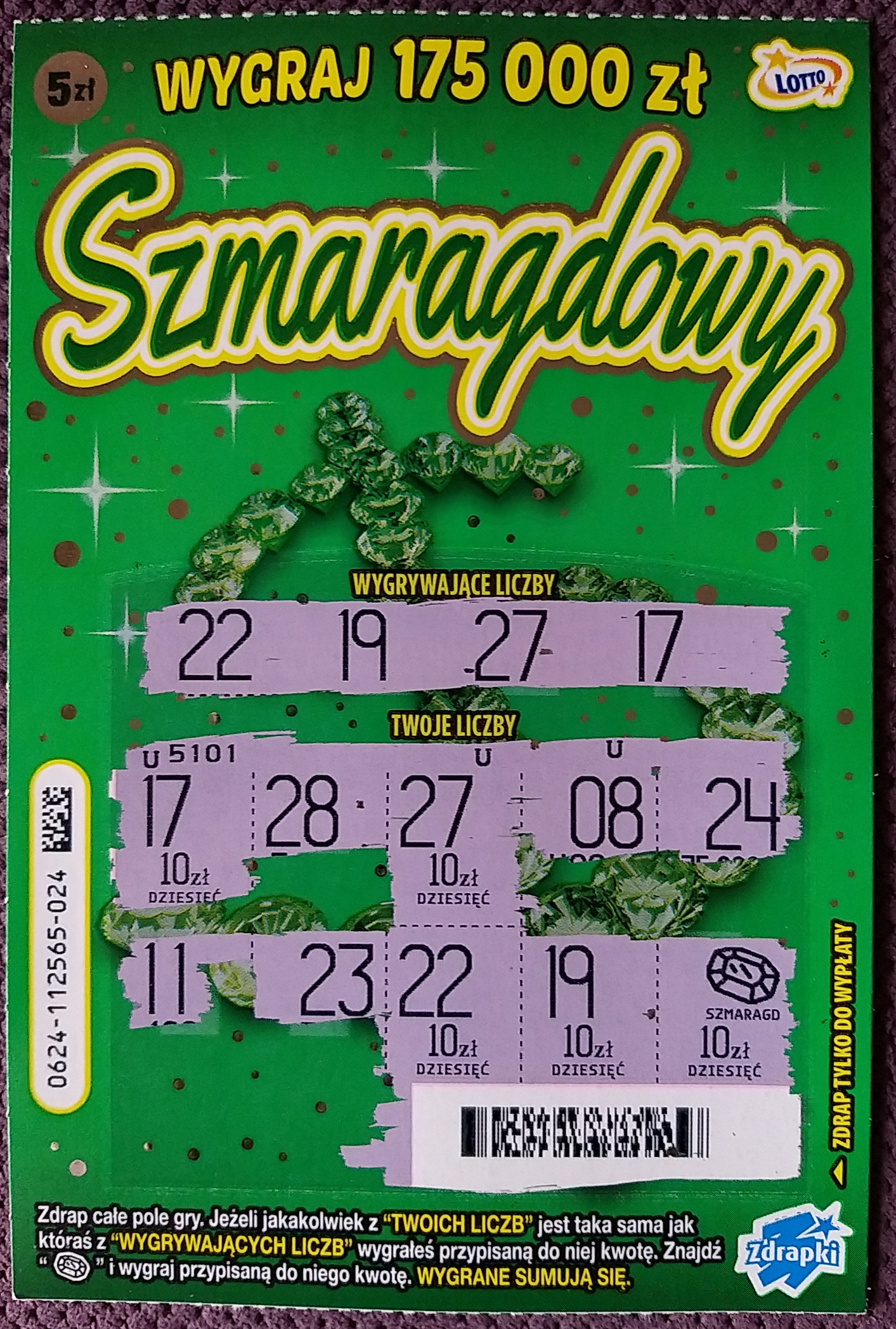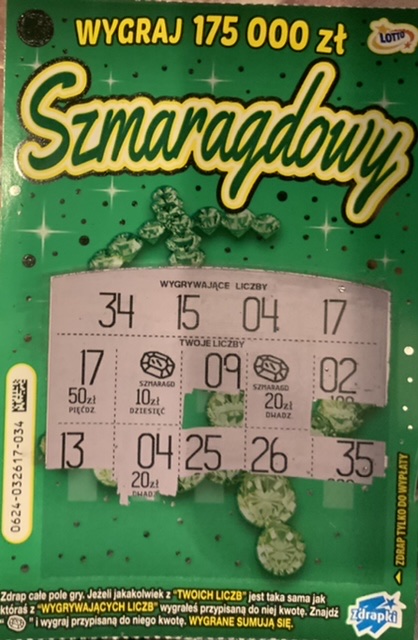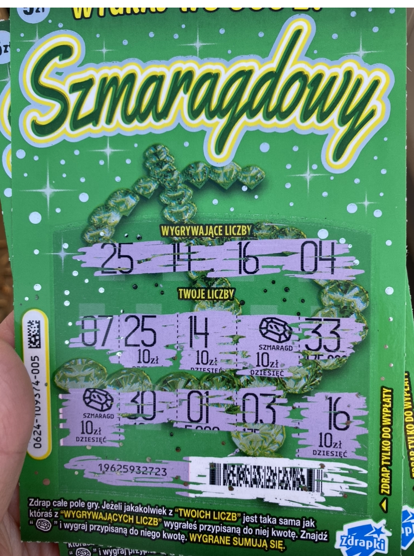Wczoraj wpadla stówka przy jednej sztuce w numerze 9 lekki szok, cała zdrapka była wygrana w kwotach po 10 zł, bez szmaragdu.