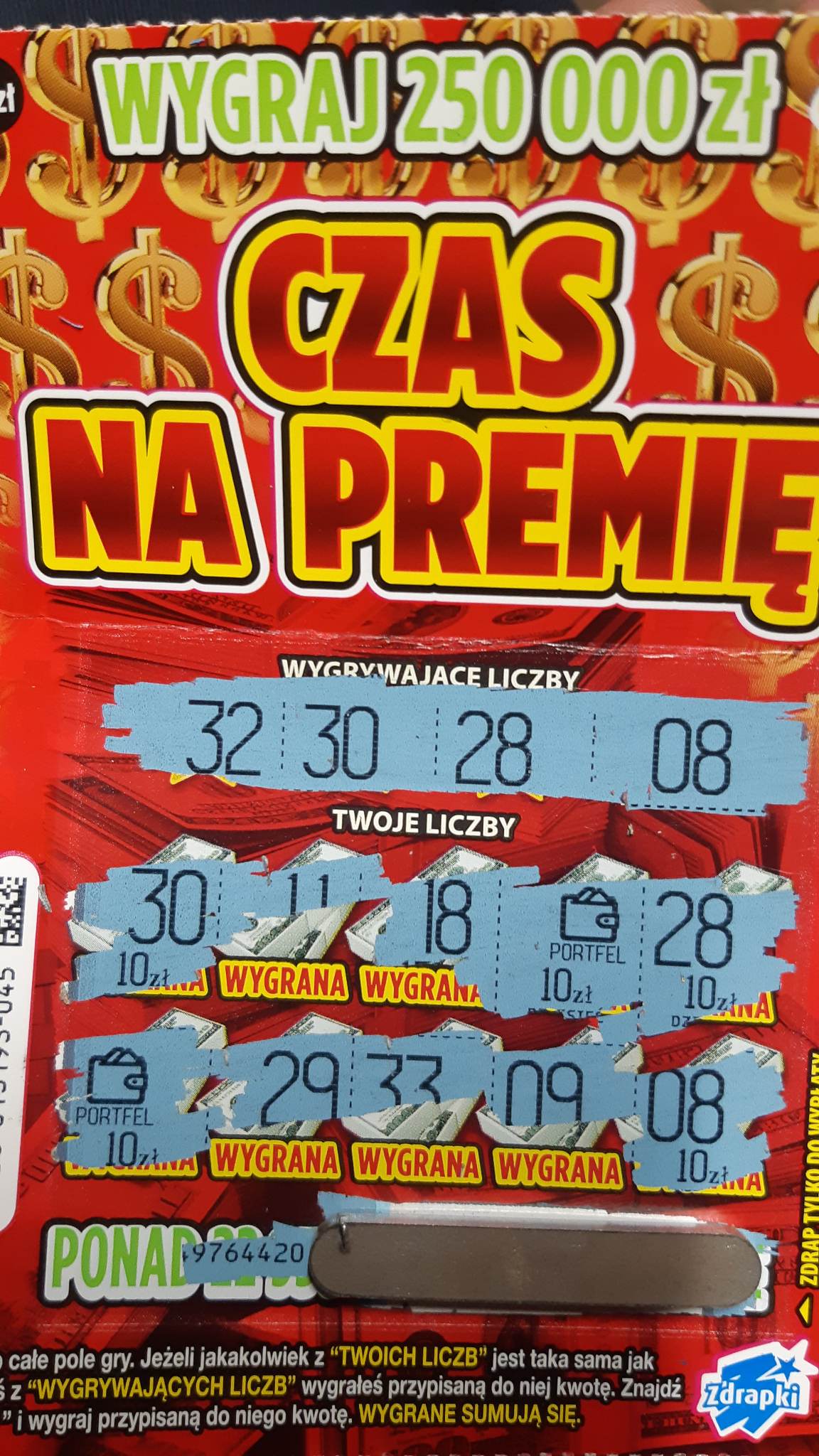 Odkopie trochę temat. Wczoraj z braku laku wziąłem 4 sztuki. Dwie puste na jednej dyszka rozbita na dwie piątki pod postacią portfela, na drugiej 15zl pod jedną z liczb. Czyli minimalnie na plus.