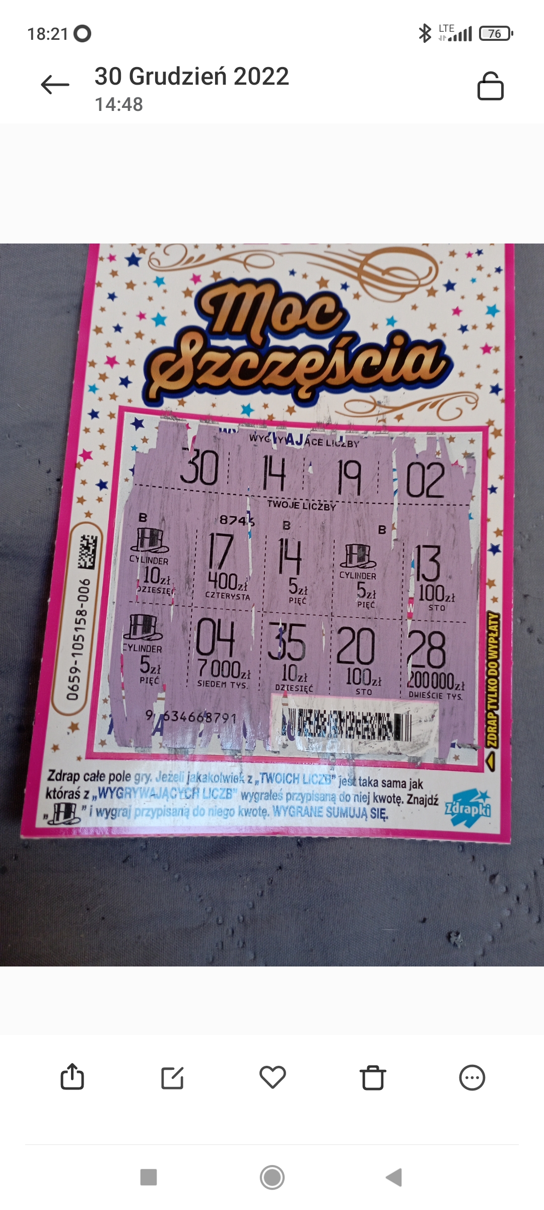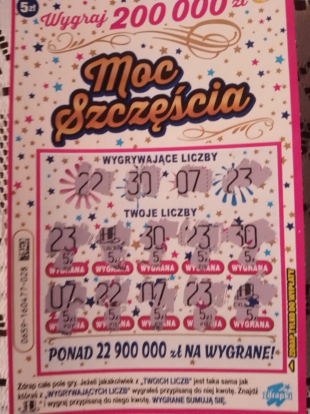 Kupiłem w końcu ta zdrapkę. Od Piątku jakoś nie było możliwości tam gdzie byłem albo zamkniete albo Totalizatora nieczynny. Dzisiaj w Żabce jedna sztuka i 25 zł więc dobry początek. Jak będę miał okazję to kupię jedna sztukę a reszta wypłacę.