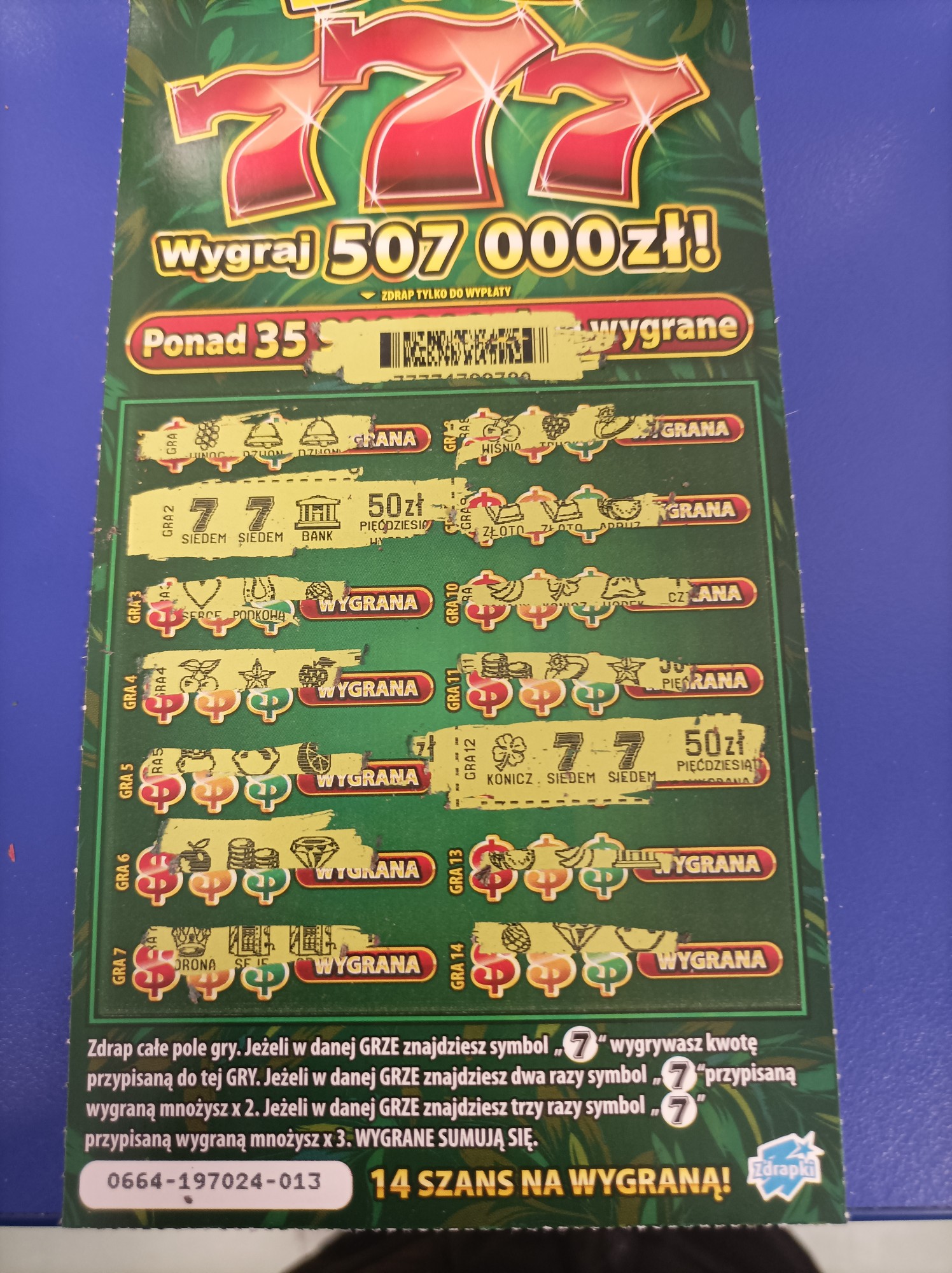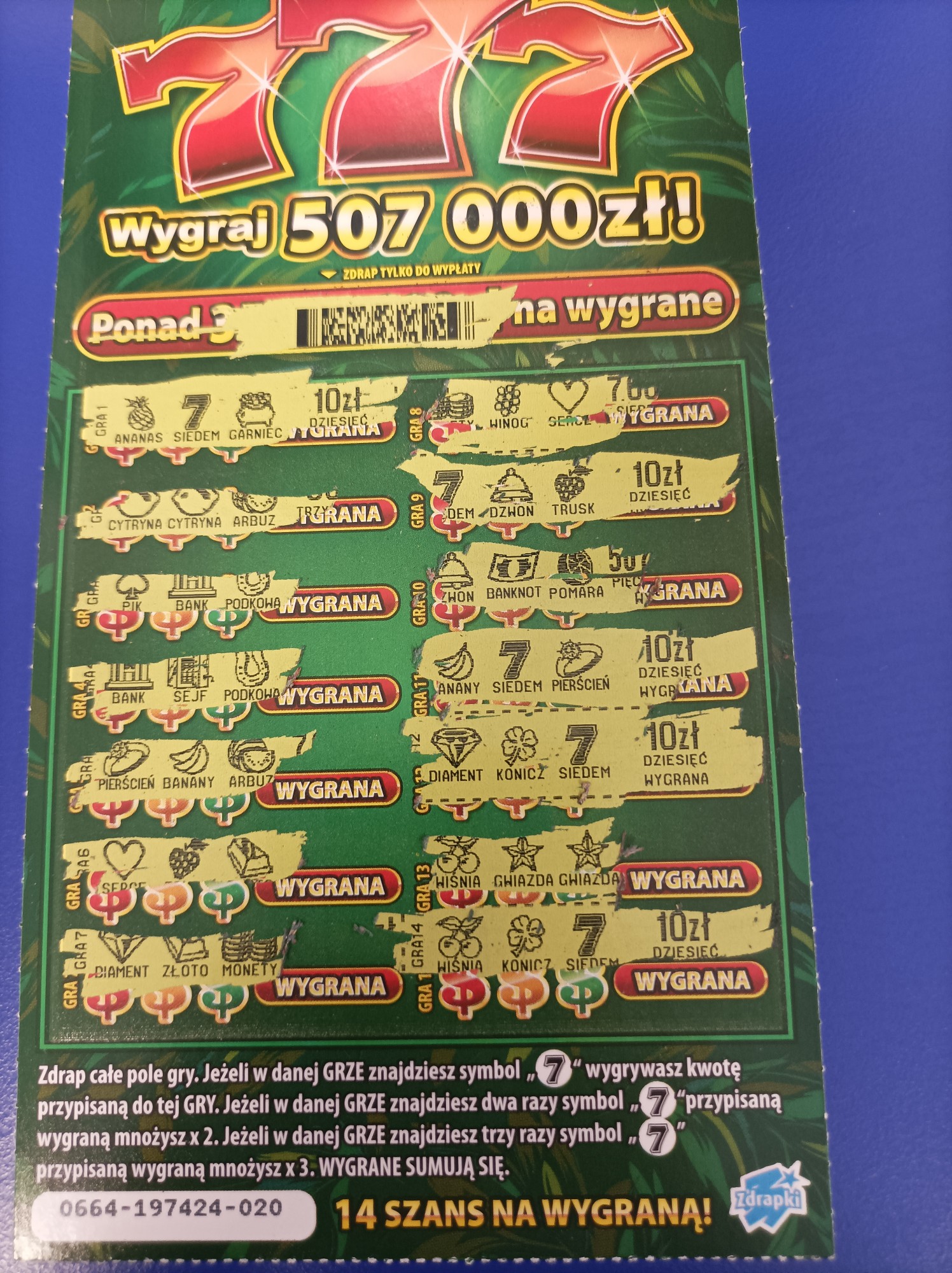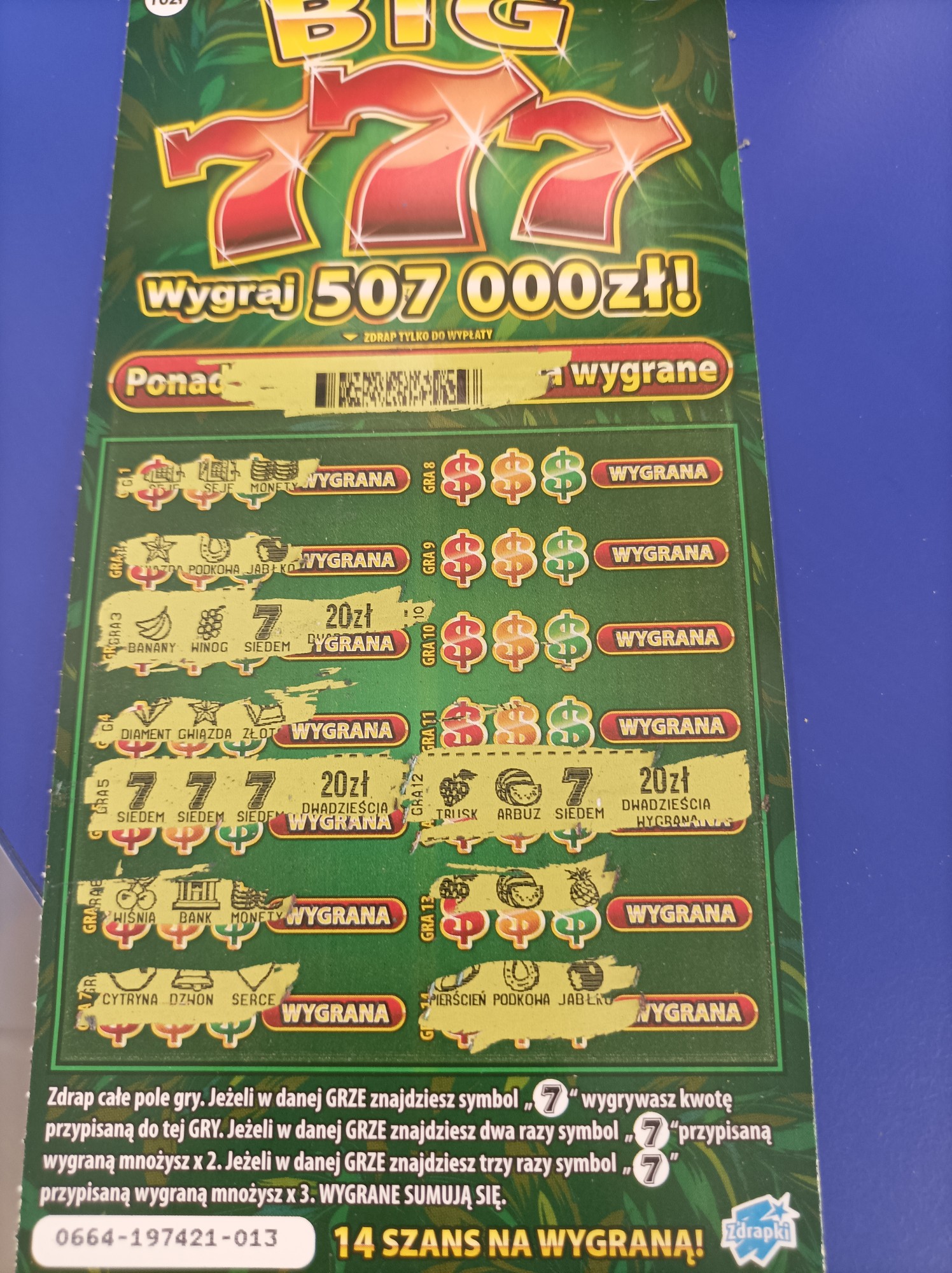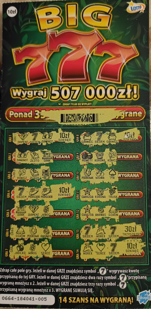 Ale mam farta do niej od premiery. Wczoraj wpadło przy 1 sztuce 30 , a dziś brane po kolei i drapane w kolekturze wpadło 20 , 10 i 200 ziko