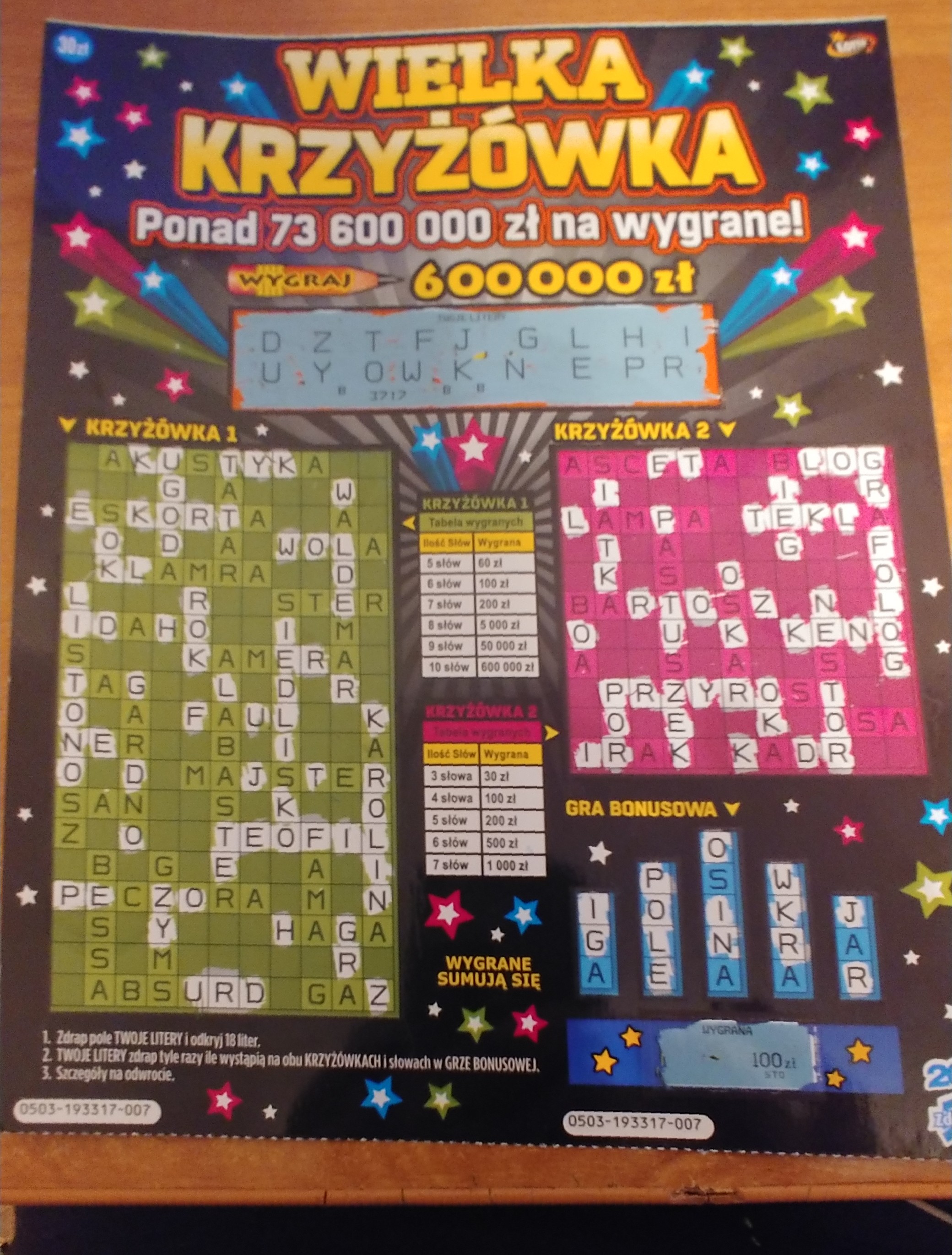 A u mnie w galerii w kolekturze otwarto dzisiaj nową paczkę. Wzięłam dwie sztuki - pusto. Stwierdziłam, że przy następnym zakupie coś trafię, bo szansę są większe. Znowu wzięte dwie - obie puste. Ostatecznie zostało 6 sztuk i wiedziałam, że trzy z nich są pełne, więc postanowiłam drapać na miejscu po kontrolnych. Dwie kolejne puste, a na koniec trzy pełne. Dwa razy zwrot 30 zł i raz 60 zł. I takim o to sposobem rozpracowałam całą paczkę Wielkiej Krzyżówki