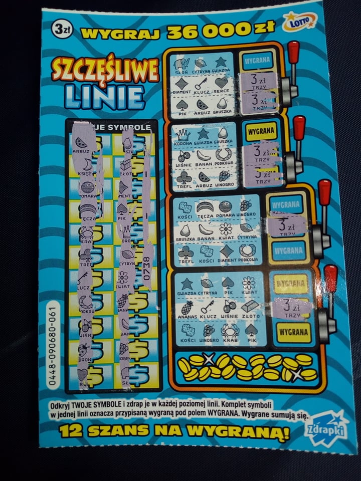 Wygrana w Szczęśliwych Liniach w Zielone padła w kolekturze, w której dość często zaopatruję się w zdrapki. Na pewno też kupowałem tam Szczęśliwe Linie... Szkoda, bo takie 36 koła w zdrapce to byłoby coś