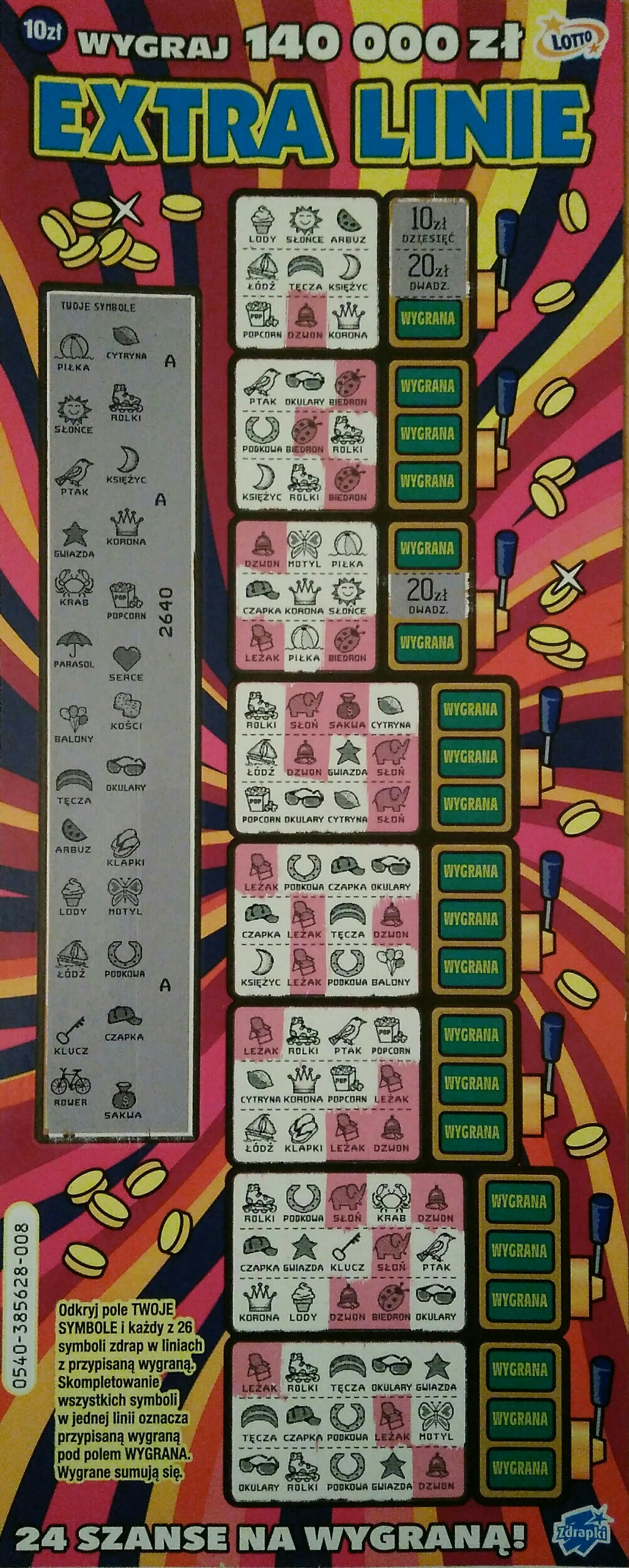 Ostatnia główna w tej zdrapce znajduje się na kolorze czerwonym/bordowym, Gorący przedział to 240 000 - 280 000. Dodatkowo dodruk dla tej konkretnej transzy to są numery od 400xxx do 404xxx.