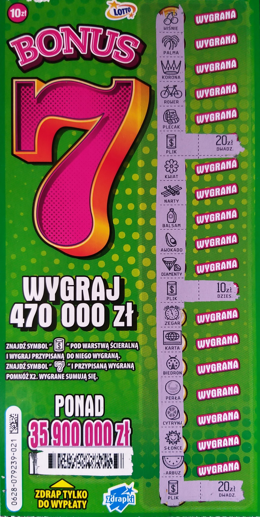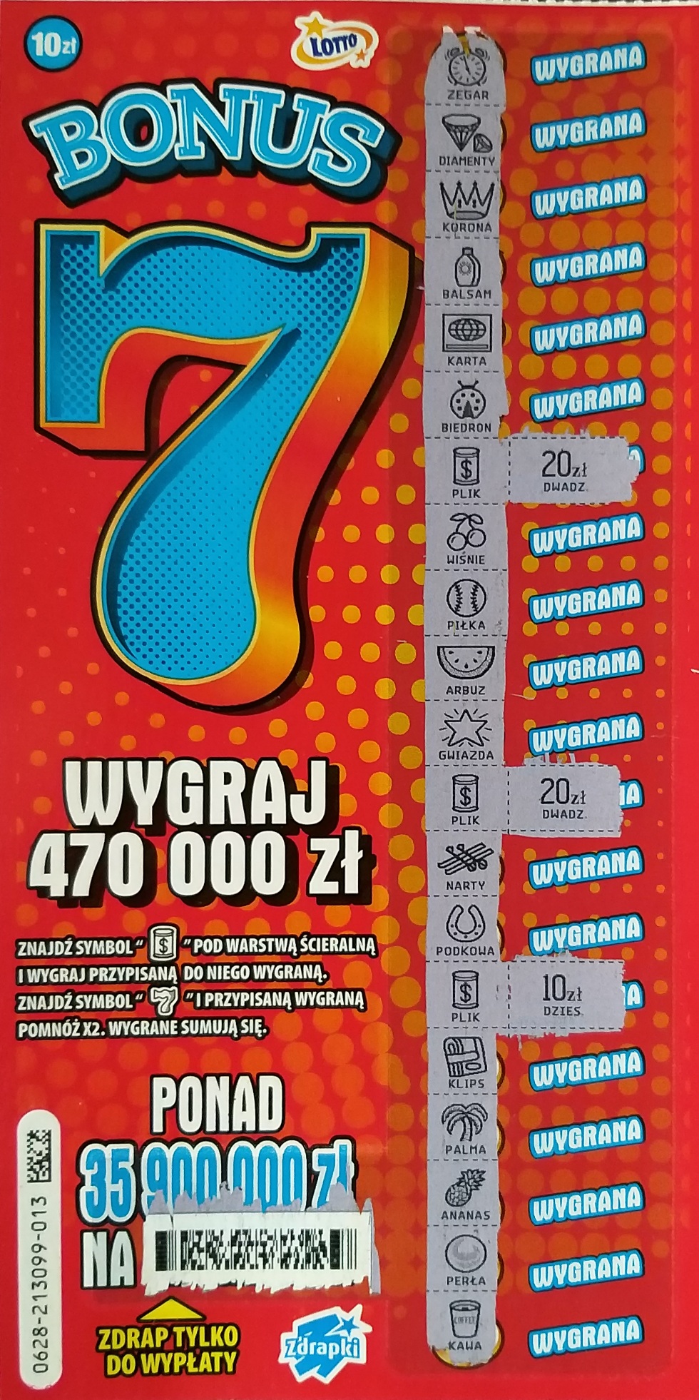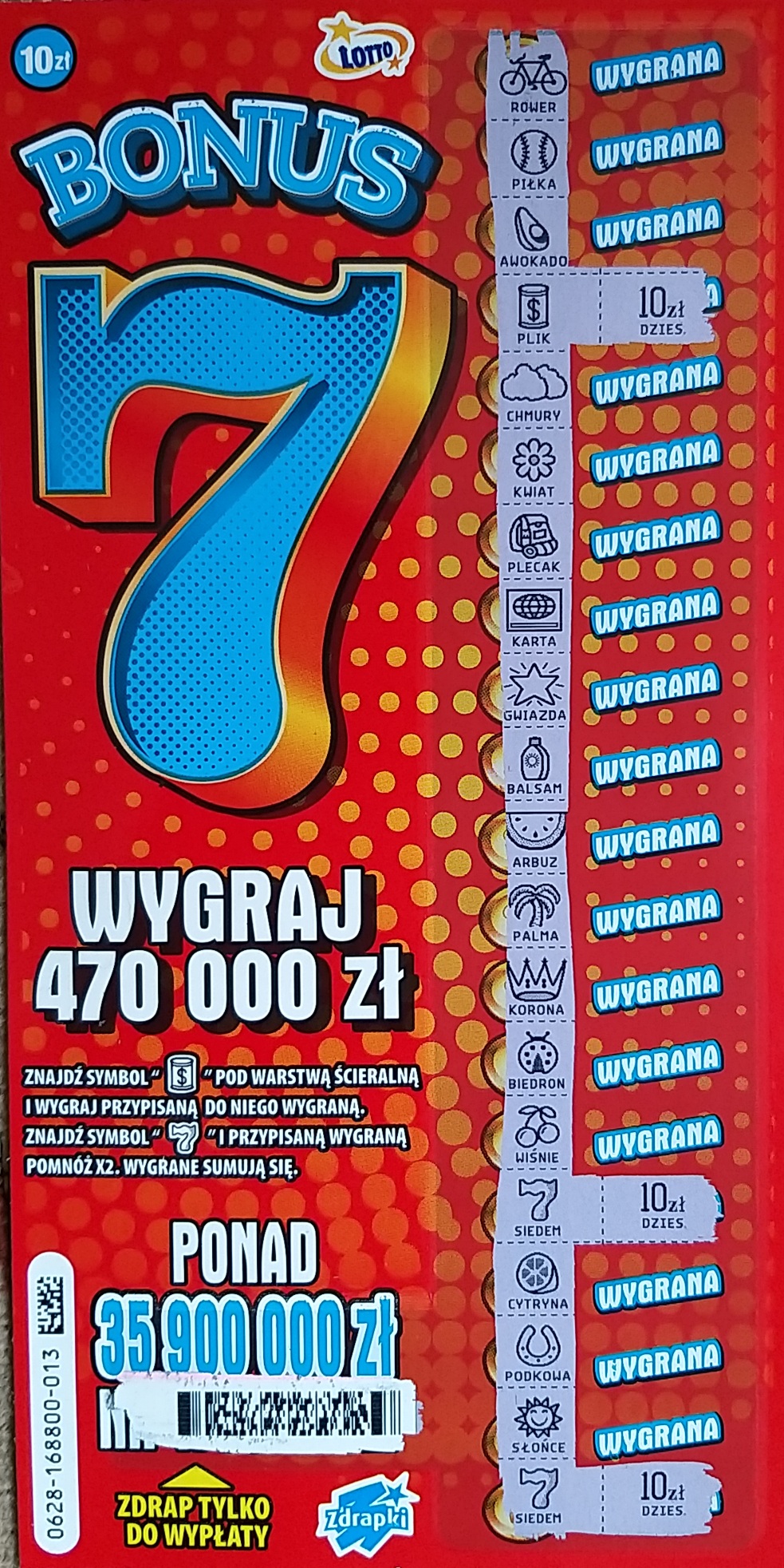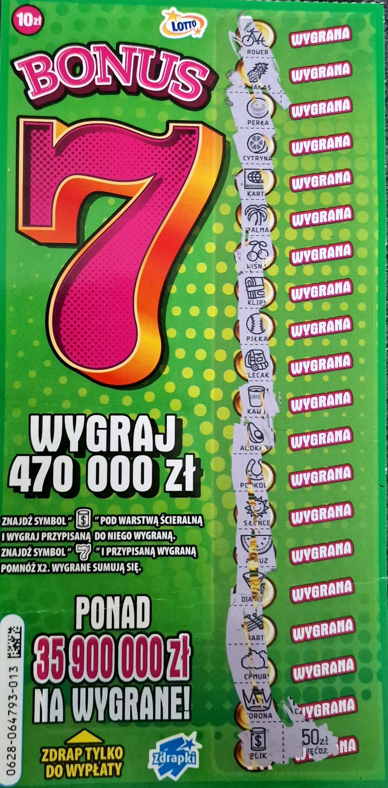 Ogólnie to miałem wziąść tego nowego Super Bonusa, ale babeczka kupiła jednego i trafiła 50 więc to odpuściłem, zresztą jakiś taki nijaki, wziąłem sobie Bonus7 013 ot tak niby pechowo ale jest 50