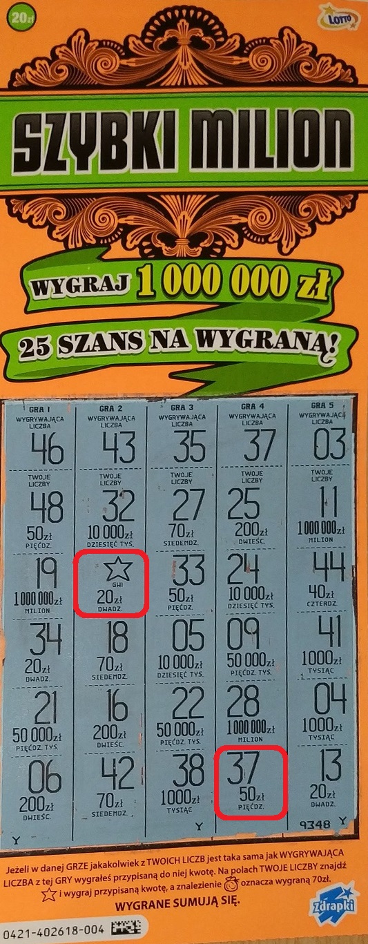 W trzech ostatnich paczkach z Szybkiego Miliona brałem nr 13 i akurat były najwyższe kwoty z paczki - odpowiednio 50, 100 i 70 zł. Ale dziś zachęcony pozytywnym efektem liczby 13, pojechałem do innego punktu lotto, wziąłem 13 i był pustak. Możliwe, że dotyczy to bardziej zbliżonych numerów serii ale na ten moment to moja czysta hipoteza bez poparcia