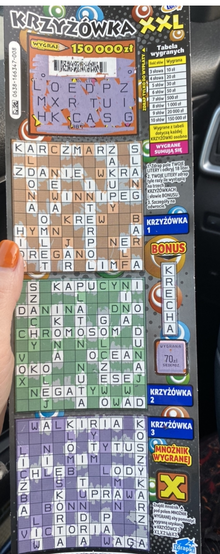 Szukając ŚO i mając całkiem pokaźny zasób gotówki coś mnie skusiło na jedną krzyżówkę i wydrapałam w bonusie -70 zł Taką KRECHĘ to ja lubię