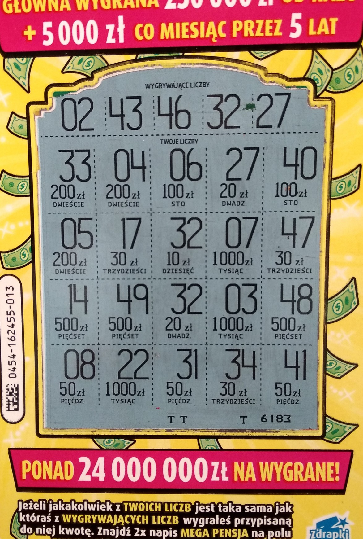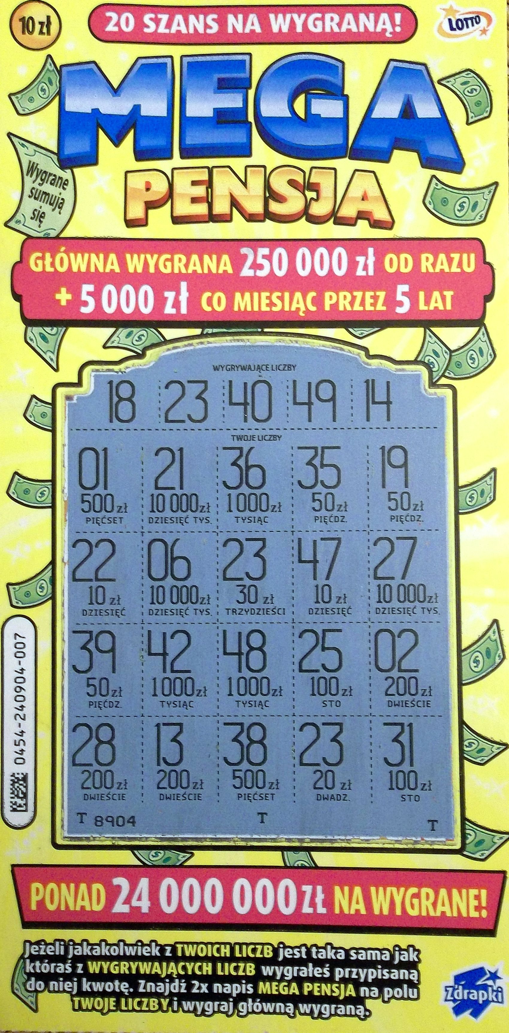 Gratuluję. Dla mnie niestety zepsuli Mega Pensję :/ Czasem wezmę ją z sentymentu ale po pierwsze, idzie mi w niej tragicznie i max co mogę w niej wygrać to 20 zł od wielkiego święta, a dwa, że warstw ścieralna tej zdrapki jest tragiczna. Tęsknie za dawnymi edycjami, gdzie szło trafić 50 i 100 zł, i gdzie przede wszystkim warstwa ścieralna była do zdrapania a nie do zdarcia :/