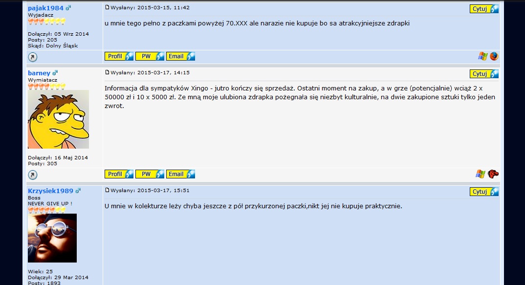 przepraszam, czy kolega to jest ten sam barney co ze starego forum?barney pisze: ↑17 lut 2021, 16:40Zachęcony powyższą gonitwą za głównymi wygranym pojechałem do jednej kolektory z listy. Usłyszałem od milej pani "tak, mamy zdrapki ale z powodu wejścia nowej serii sprzedaż tej starej jest zablokowana". To samo usłyszałem w innej kolekturze jak szukałem rok temu "gorących" Mega Pensji. Tyle w temacie polowania na okazje.