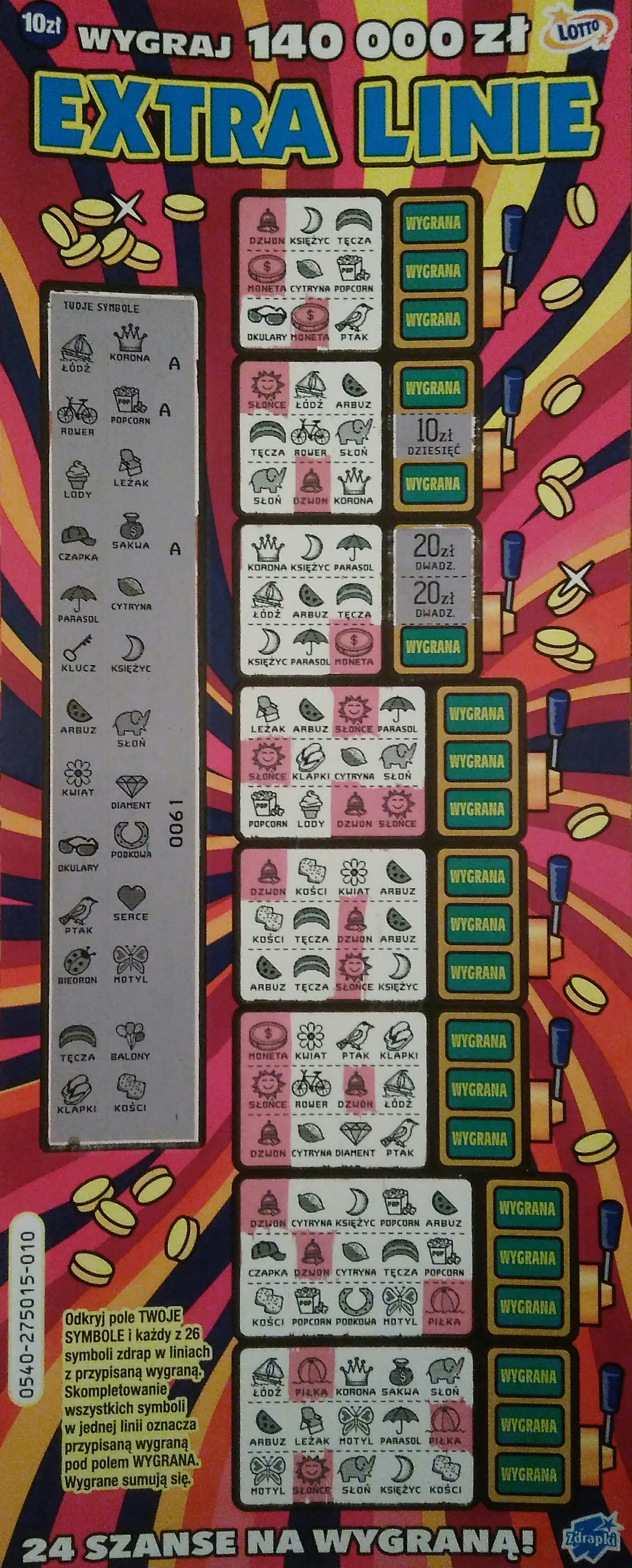 Jest 17903 punktów lotto na mapie Polski. Licząc , że w każdym punkcie była by paczka czyli 25 sztuk zdrapki to w obiegu musiało by być 447 575 zdrapek. To już widać , że w połowie punktów tej zdrapki nie ma. A w niektórych pewnie zalega po parę sztuk paczek. Dlatego w wielu rejonach gdzie zdrapka się lepiej sprzedawała może już nie być dostępna.cyg4357 pisze: ↑19 cze 2021, 1:17Jestem tu nowy ale chcialbym sie podzielic z wami pewna informacja. Jestem z Ilawy woj war-maz. Pojechalem dzis do glownej kolektury w miescie pytajac sie czy dostane Extra linie.