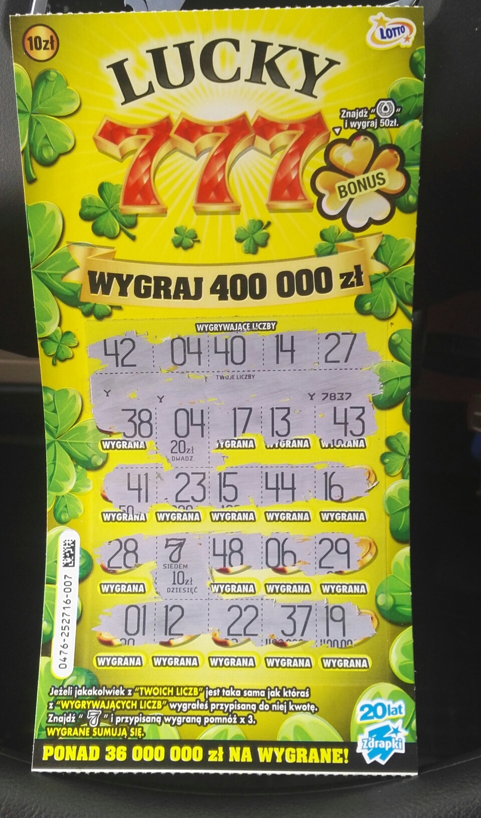 Lucek to się w grobie przewraca patrząc na moje dokonania w tej zdrapce. Póki co najbardziej dla mnie pechowa, zaraz obok Premii 777.newużytkownik pisze: ↑18 cze 2019, 14:37Dziś za 20 zł z Mega Pensji wziąłem 2 x Lucka z "M jak miłość". Zobaczymy co pod nr 12 i 13 się kryje. Jeszcze nie zdrapałem, czekam na wieczór![]()