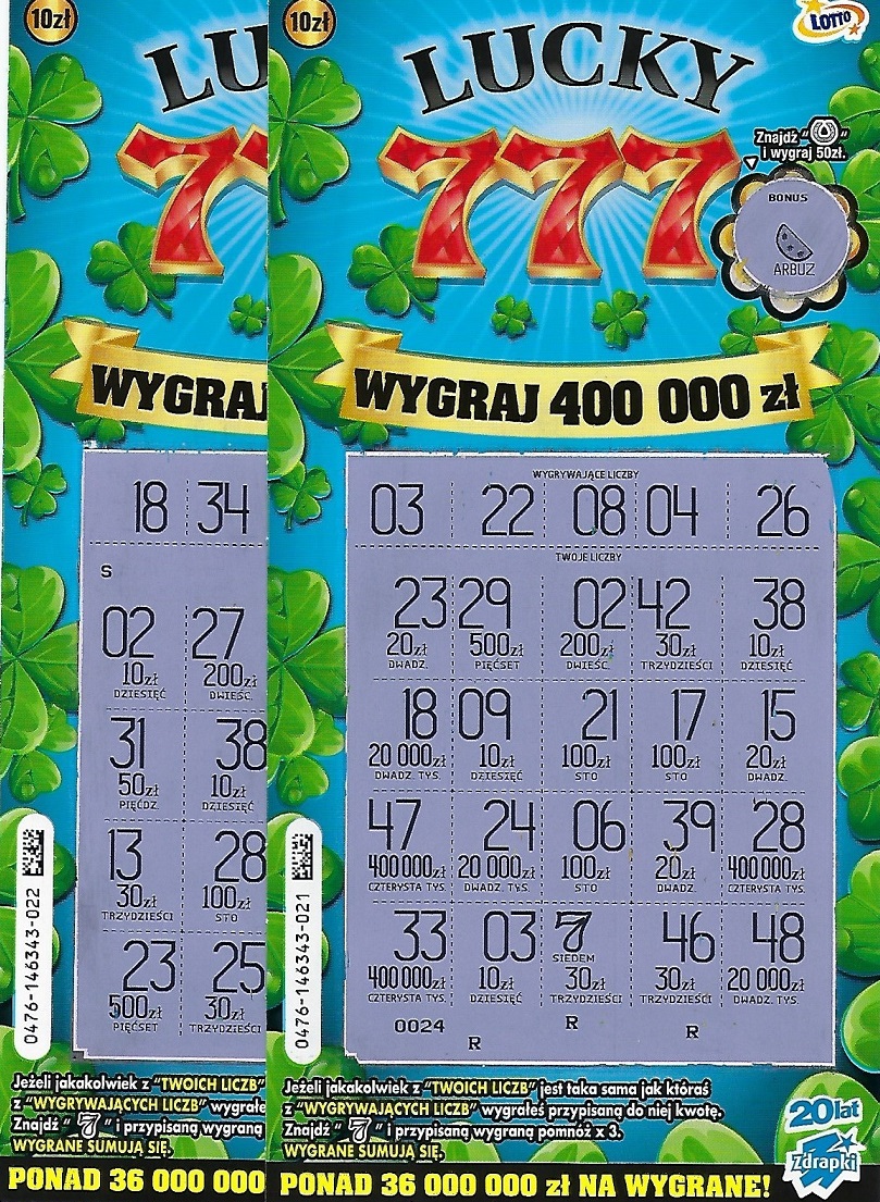 Dziś przy wymianie zdrapek z wczorajszego dnia wzięłam dwie Lucky 777 z nowej paczki, numerki obok siebie 021 i 022, pomyślałam sobie, że może coś w którymś będzie siedziało.No i siedziało