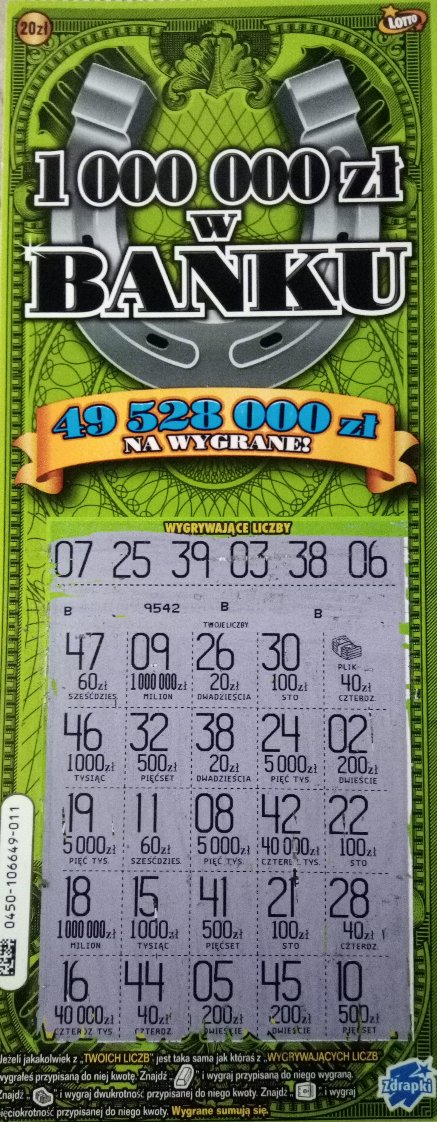 U mnie wczoraj pod tym samym nr 40 zł (2x 20 zeta pod sztabką) ze zdrapkomatu
