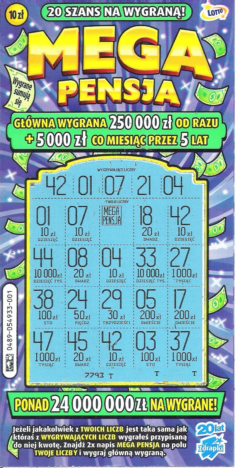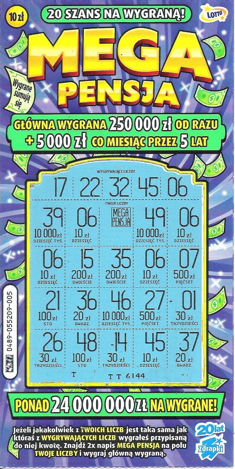 U mnie na dwie zdrapki kupione w różnych miejscach 20 zł w 007 oraz 50 zł w 001