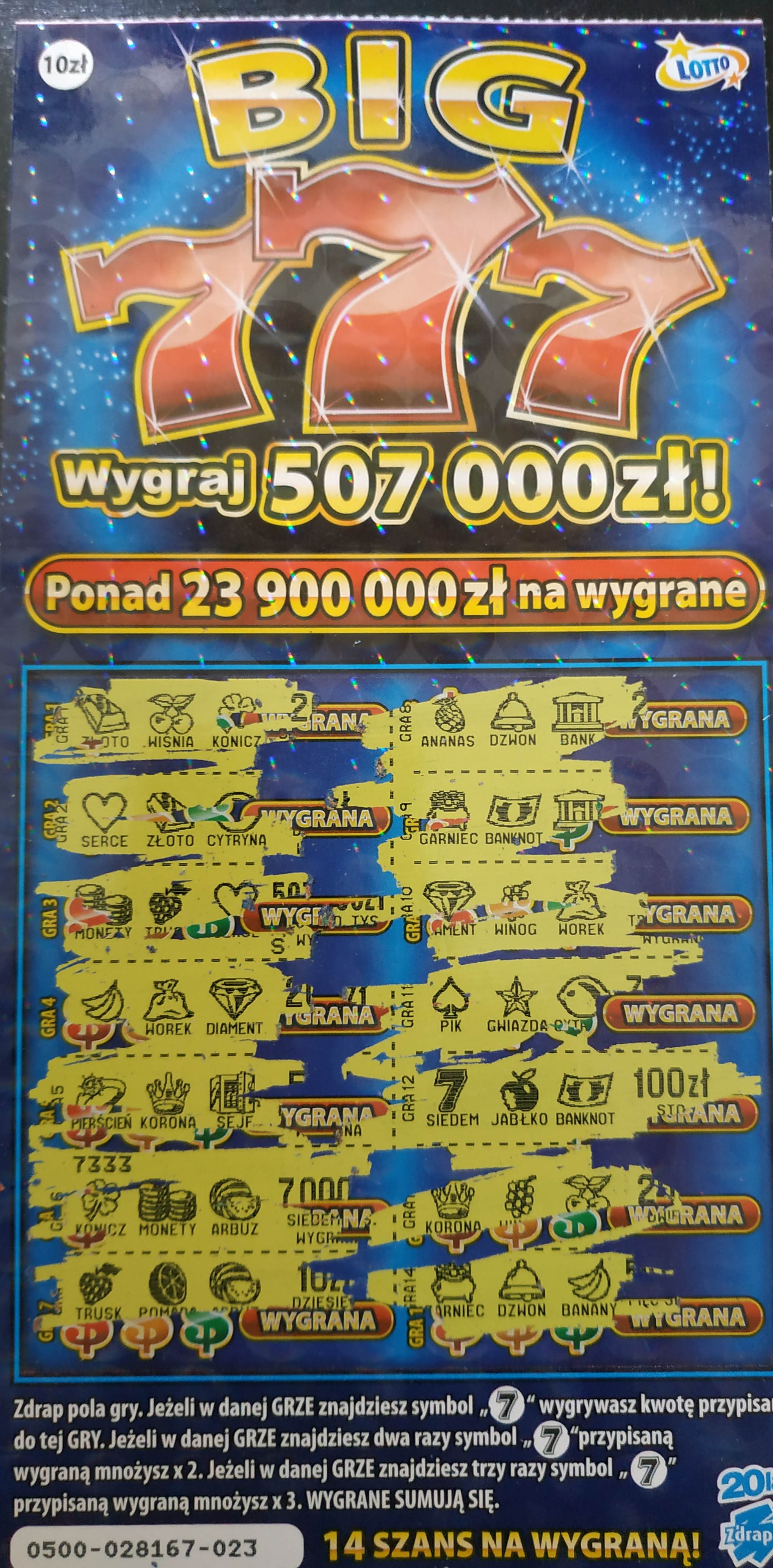 Gratulacje, tylko zastanawia mnie jedno - po co kupujecie zdrapki z przedziałami bez możliwości wygrania głównej? Wiadomo, że są jeszcze nagrody niższych stopni, no ale jak już wydawać kasę, to wypadało by mieć możliwość trafienia maxa, a nie tylko kilka stówek czy tysięcy.mzielakzielakm pisze: ↑10 wrz 2019, 15:28W jednym punkcie weszła 10 z 3 siodemkami a, w innym punkcie ku mojemu zaskoczeniu pojawił się wujek Stefan