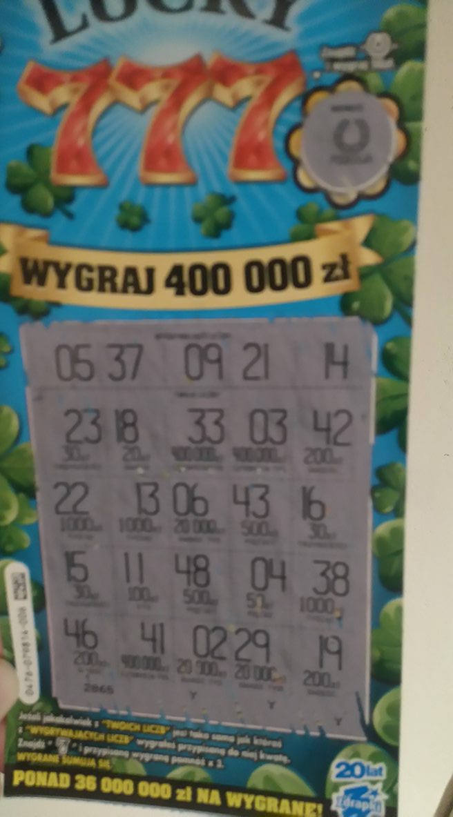 U mnie jak rzadko kiedy. Oczywiscie żadna wielka sztuka, ale ostatnio wszystko słabo szło to wrzucę. Jedna szt. z punktu w Żabce, miałem brać nr 1 jak leżą, ale o dziwo w takim punkcie Pani dala wylosować, to kombinuję ręką, patrzę nr 6 - zwykle u mnie pusto. A tu zaskoczenie. Dodam dla ciekawostki, że zapominalski nie jestem, i wszelkie bonusy zawsze drapię, ale są u mnie wybitnie nieszczęśliwe - dotąd w każdej zdrapce miałem je zawsze puste. Dobrze zacząć 50 (jest podkowa), może się z tą Lucky polubimy. Sorry za jakość.