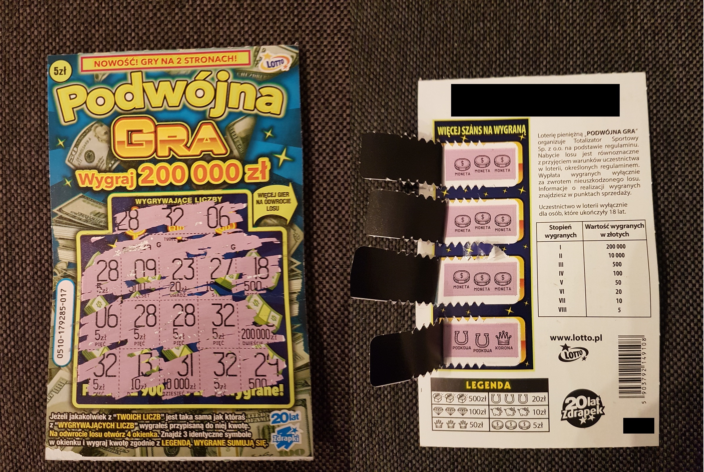 Dwie sztuki premierowe numer 6 -pusty, numer 4 - zwrot. Jak dla mnie zdrapka naprawdę fajna. Miło się drapie plus jeszcze okienka. Pewno nie moje ostatnie kupione. Być może jutro paczuszkę całą kupię.