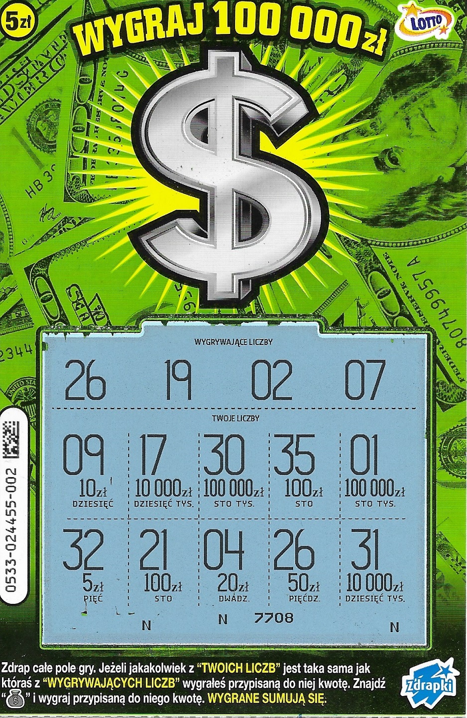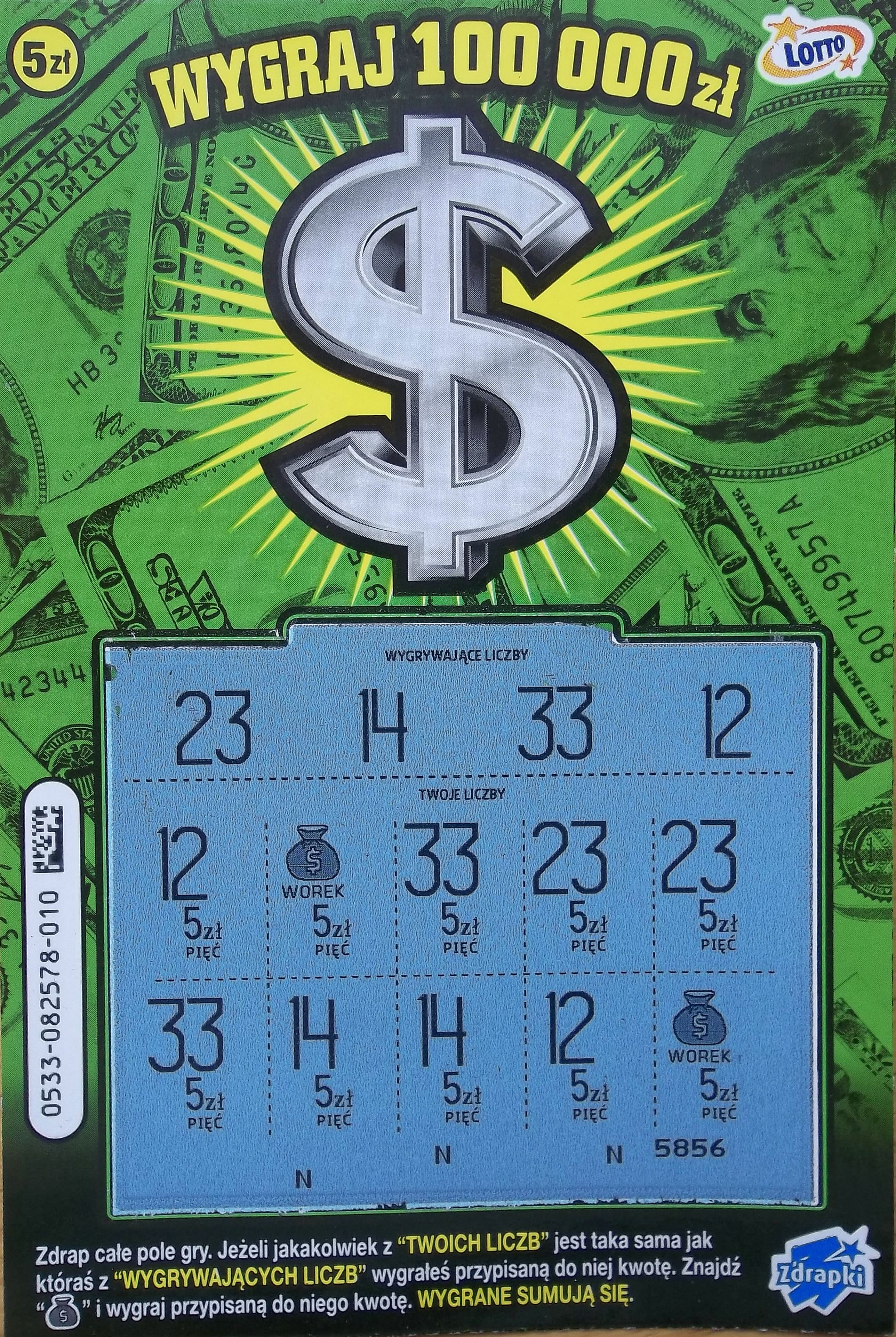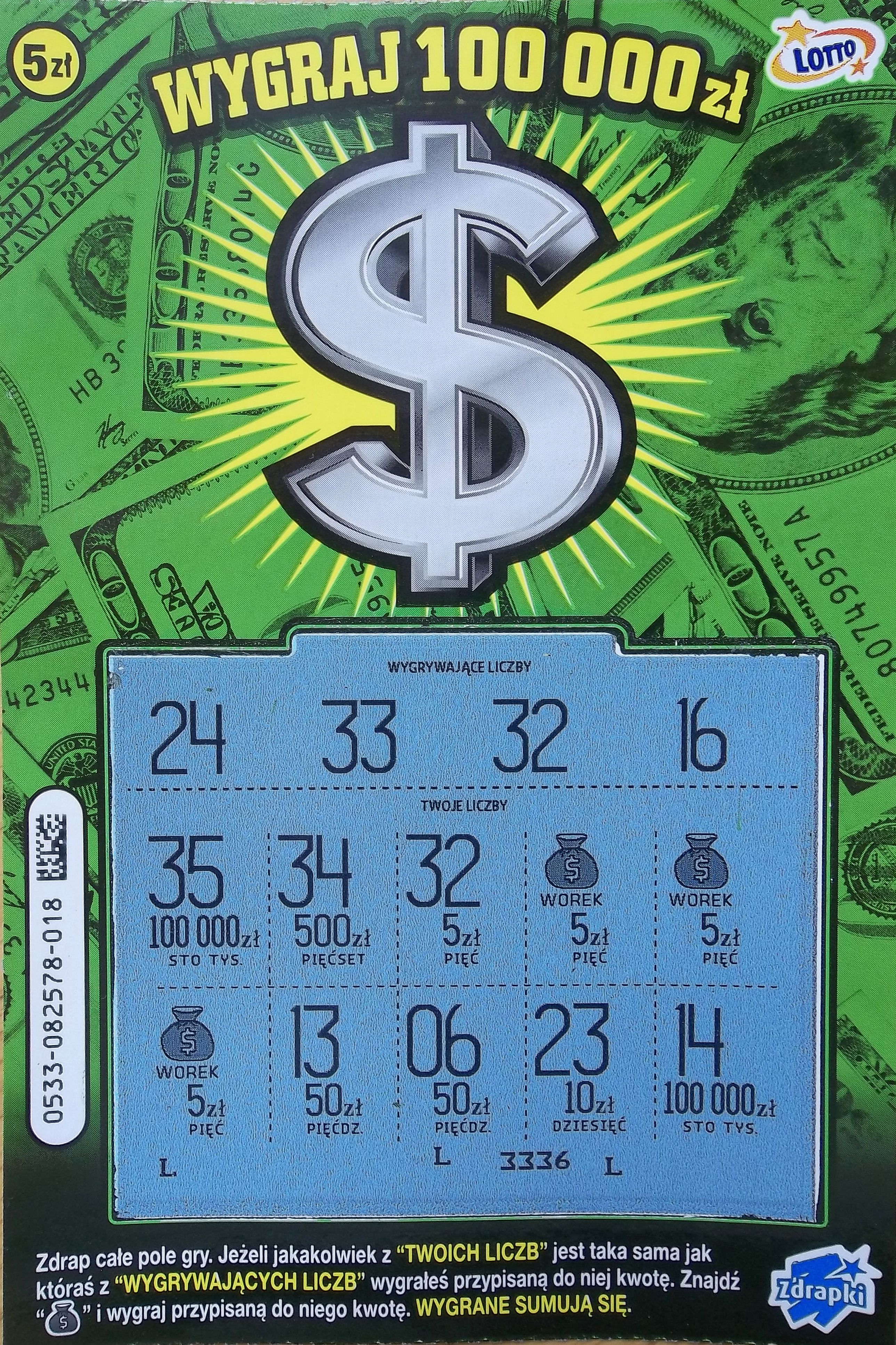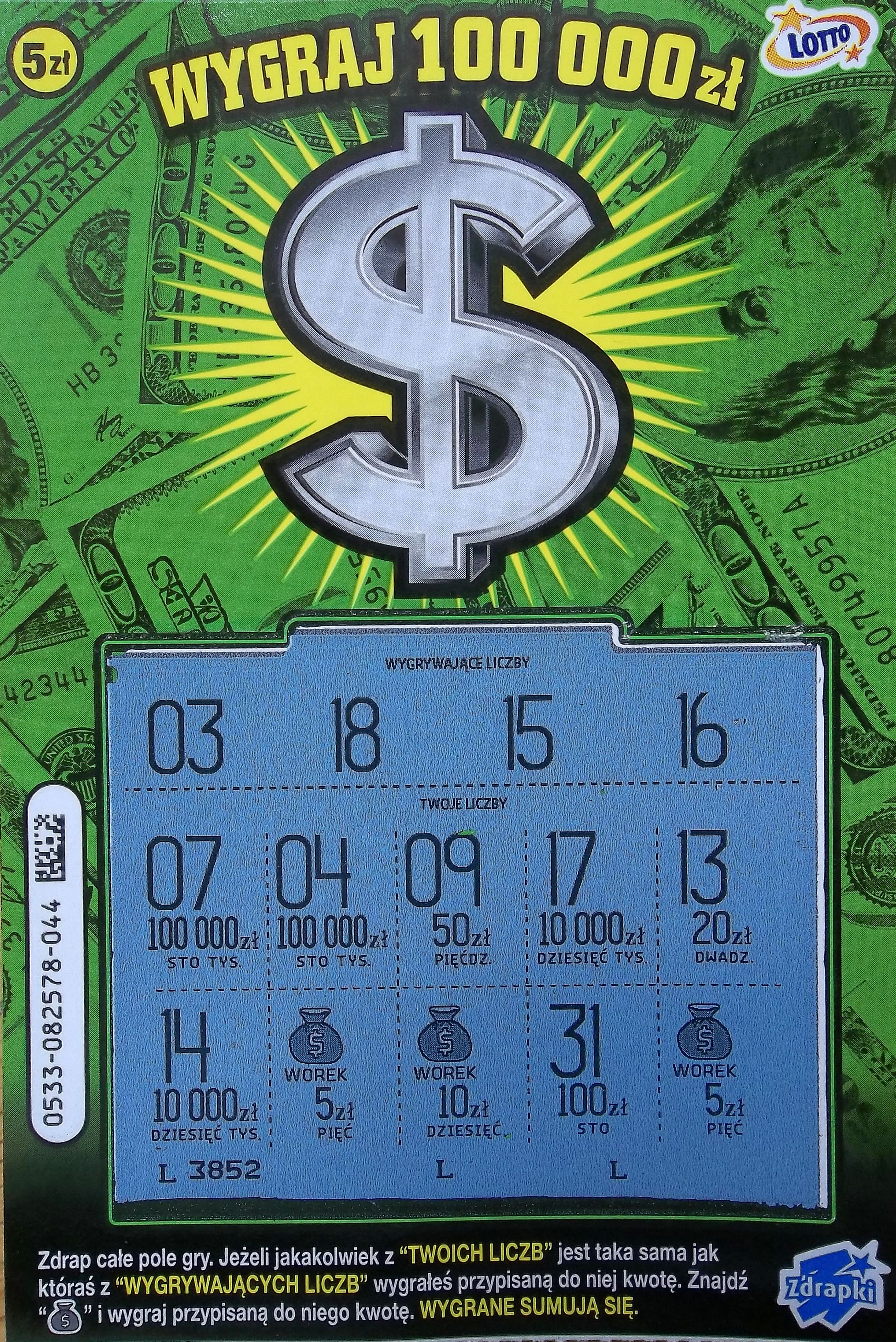 Dopiero na sam koniec wpadło 2x 20 zł w nr 018 i 044 oraz 50 zł w nr 010