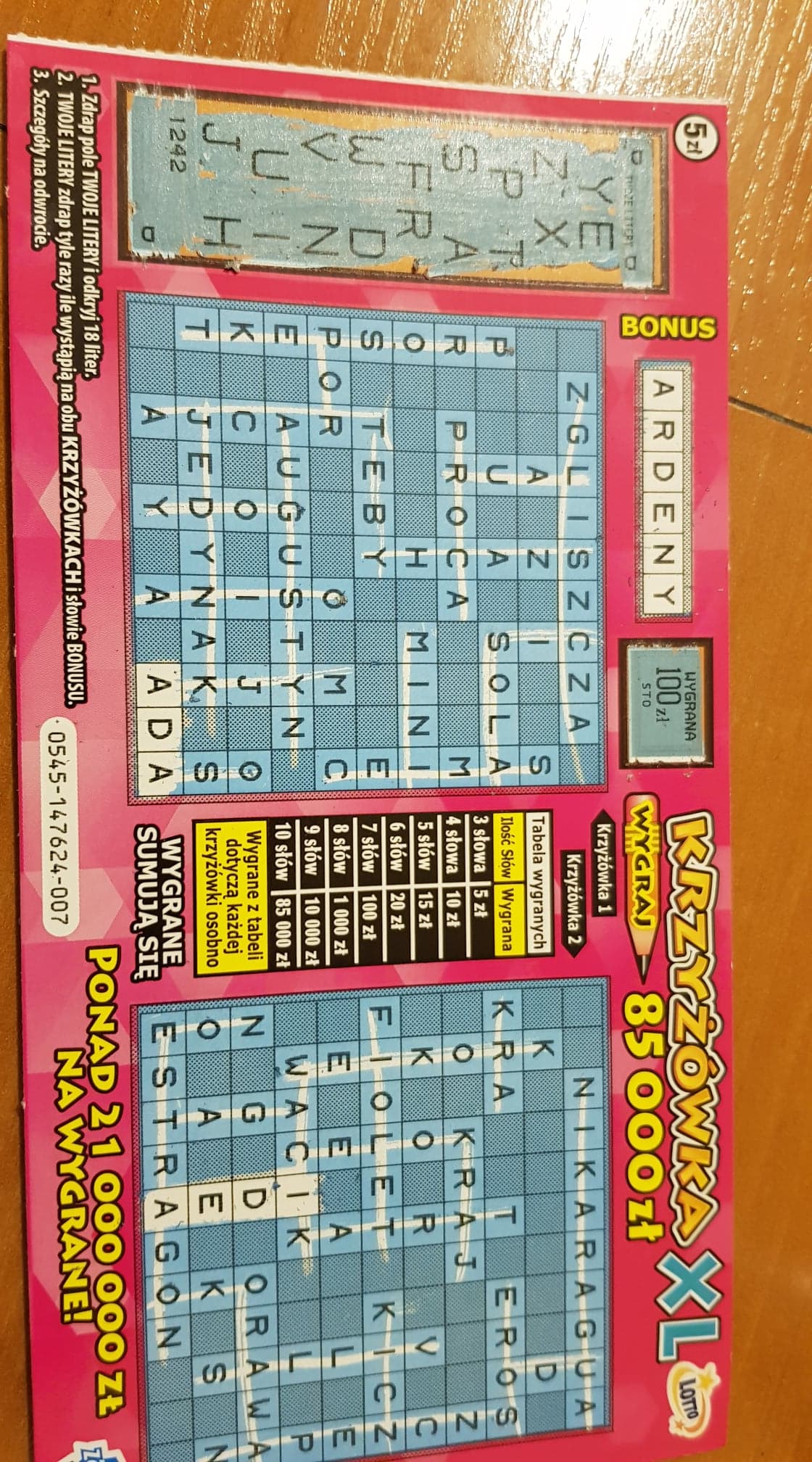 Spokojnie, drapie tę zdrapkę od wznowienia prawie codziennie, to dopiero pierwsza stówa w tej edycji. Ciezko jest trafić 100 zł w tych krzyżówkach :/MobilisA075 pisze: ↑16 mar 2021, 16:53Tyle osób trafia stówy w tym, oraz 75 w liniach , a ja max 30. A drapie nie mało
