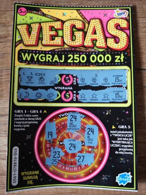 W końcu coś większego mam w tym Vegas, kupiłem dzisiaj 4 sztuki i wydrapałem 1x50, 1x5 i dwa pustaki. Prześladują mnie dzwonki w tej zdrapce, kiedyś było na nich 25 a teraz 50 :D