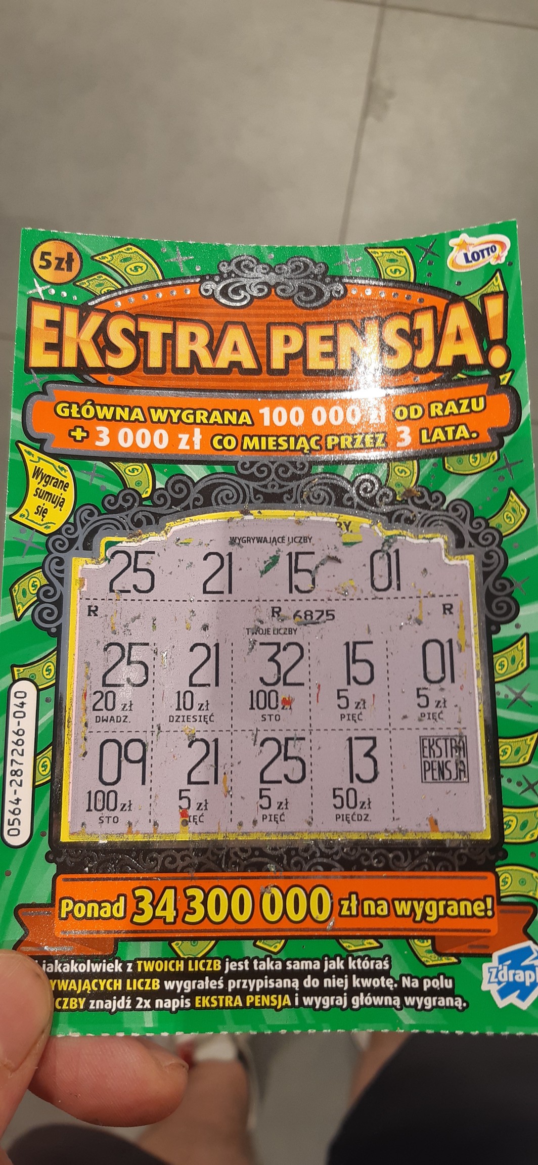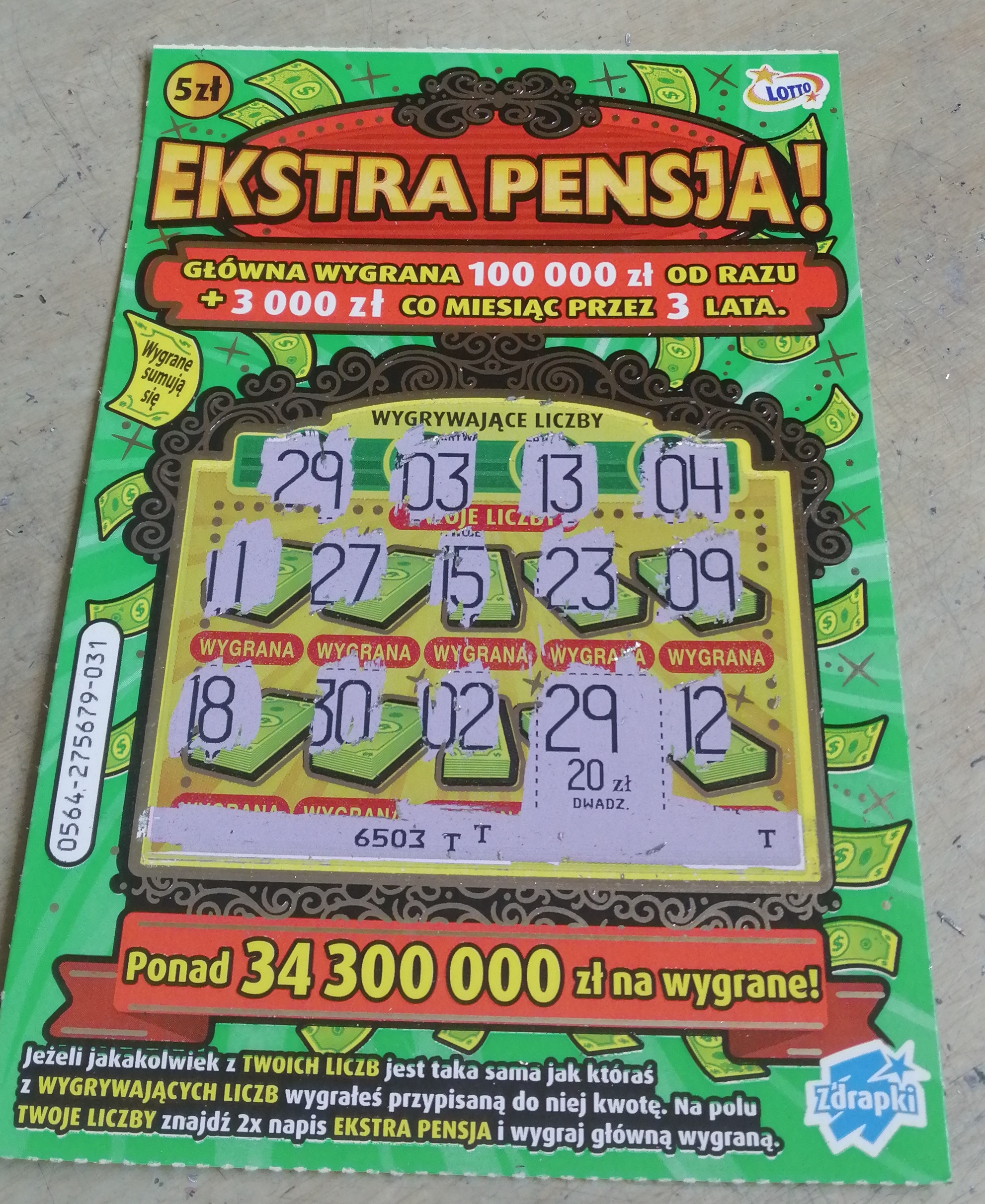 Dziś i u mnie wpadło 50 złotych. Trochę od niechcenia, z braku laku wziąłem dziś 1 szt. zielonej EP (024) i 5x pól wygranych po dyszce każde, dało 5 dych łącznie