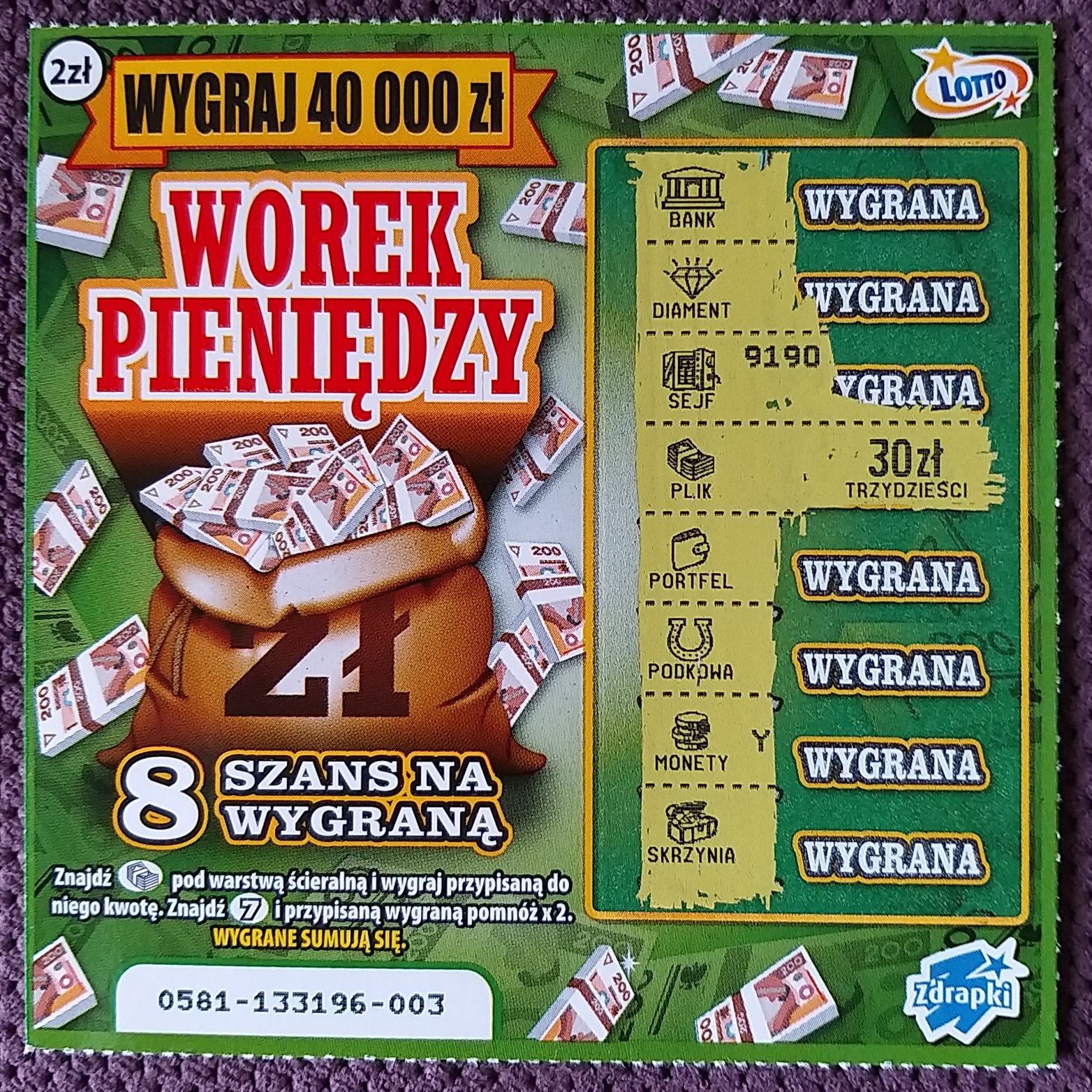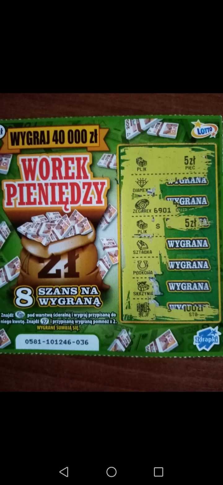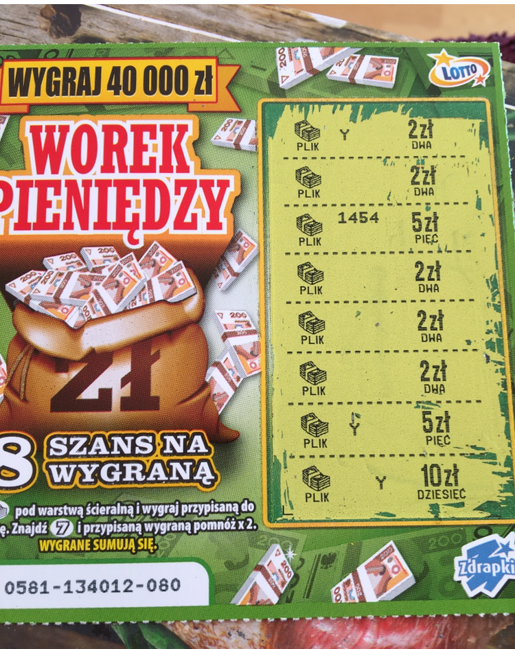 Ostatnio prawie nie kupuję bo nic nie wchodzi. Dzisiaj jednak zaryzykowałem mały miks: krzyżówkę, worek, deszcz i trzy po zecie. Tylko worek pieniędzy dał wygraną a było to 10zł. Przynajmniej wyszło na zero..