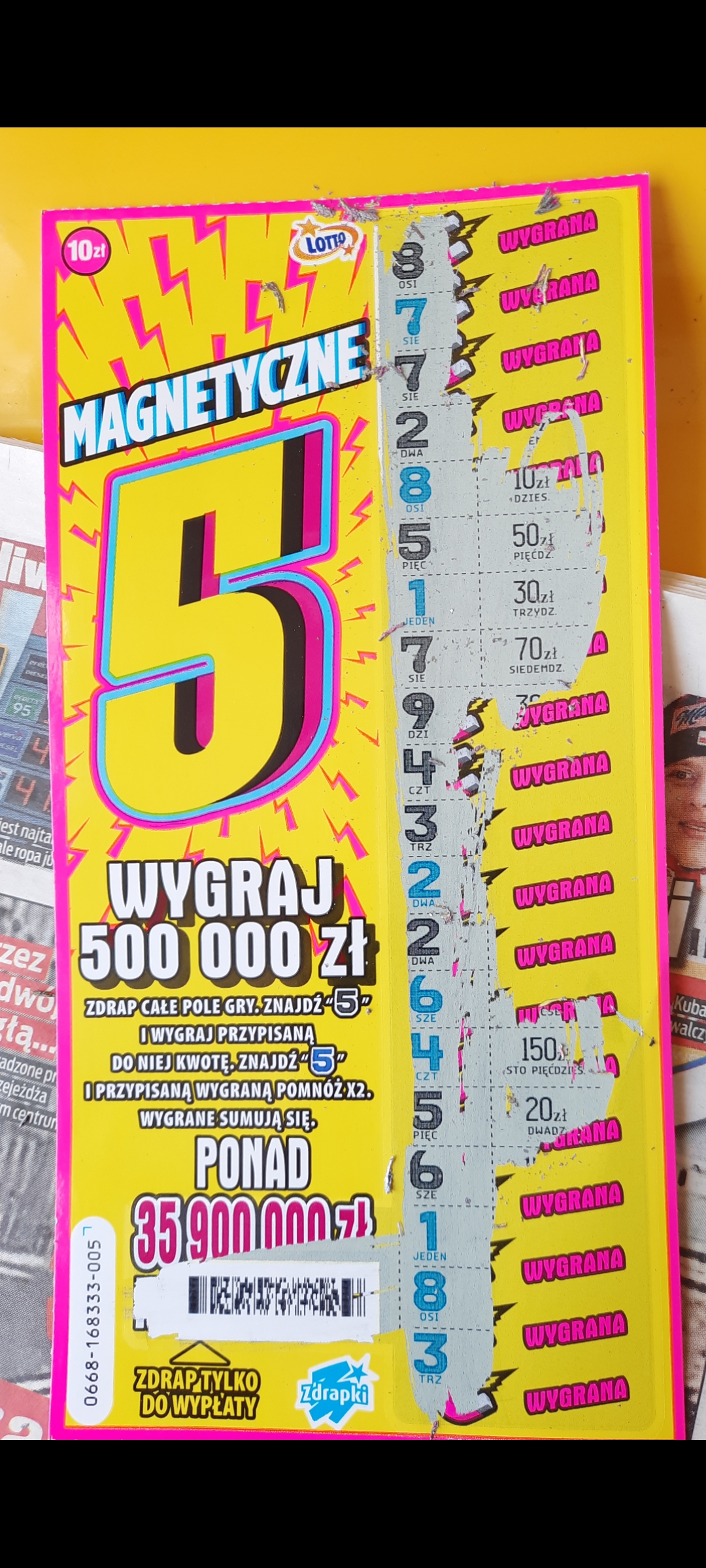 Jak nie kupuje od dłuższego czadu zdapek to wczoraj mnie cos podkusiło i wziąłem na próbę tą Magnetyczna 5 i w numerze 004 trafiło się 50 zł. Wypłaciłem od razu i w innej kolekturze wziąłem raz jeszcze ten sam numer i wpadło 20 zł.